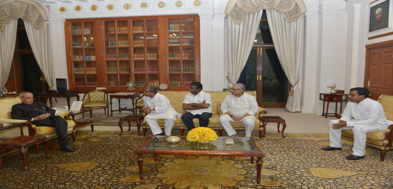 The President of India, Shri Pranab Mukherjee meeting with Dr. Manas Bhunia and others, at Rashtrapati Bhavan, in New Delhi on August 20, 2015.