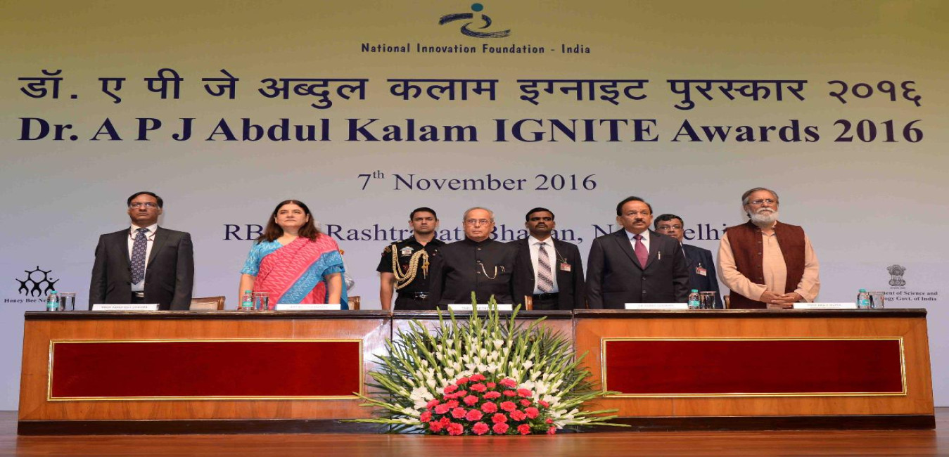 The President of India, Shri Pranab Mukherjee presenting the Dr. APJ Abdul Kalam IGNITE Awards to the winning children of IGNITE competition, organized by the National Innovation Foundation, at Rashtrapati Bhavan Cultural Centre on November 07, 2016.