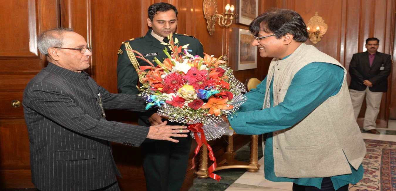 The President of India, Shri Pranab Mukherjee meeting with Shri Manish Mishra with others from Friends for Life, at Rashtrapati Bhavan on January 20, 2016.