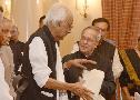 The President of India, Shri Pranab Mukherjee presenting the Sunil Gangopadhyay Memorial Award for Excellence in Bengali Literature to Eminent Poet and Litterateur to Shri Nirendranth Chakravarty and Shri Sankha Ghosh for the year 2012 at Raj Bhavan of Kolkata in West Bengal on Jan 11, 2014