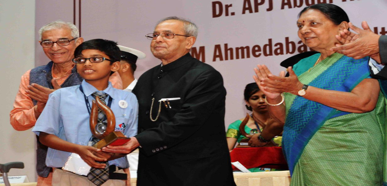 The President of India, Shri Pranab Mukherjee presenting Dr. APJ Abdul Kalam IGNITE Awards- 2015 to creative children, at IIM, Ahmedabad, Gujarat on November 30, 2015.