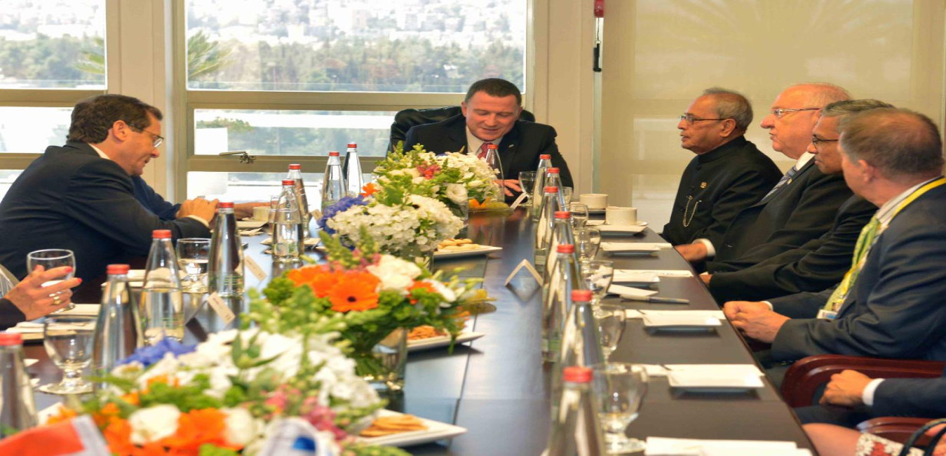 The President of India, Shri Pranab Mukherjee with the President of Israel, Mr. Reuven Rivlin, the Prime Minister of Israel, Mr. Benjamin Netanyahu, the Speaker of Knesset, Mr. Yuli-Yoel Edelstein and the Leader of Opposition, Mr. Issac Herzog, during a meeting, at Knesset, Jerusalem, in Israel on October 14, 2015.