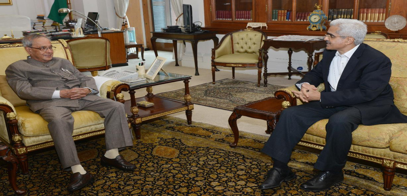 The President of India, Shri Pranab Mukherjee meeting with Shri Shaktikanta Das, Secretary, Economic Affairs, Ministry of Finance, at Rashtrapati Bhavan, in New Delhi on September 01, 2015.