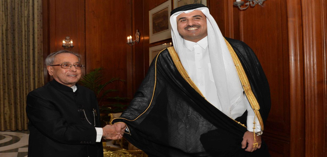 The Emir of the State of Qatar, His Highness Sheikh Tamim Bin Hamad Al-Thani calling on the President of India, Shri Pranab Mukherjee, at Rashtrapati Bhavan, in New Delhi on March 25, 2015.