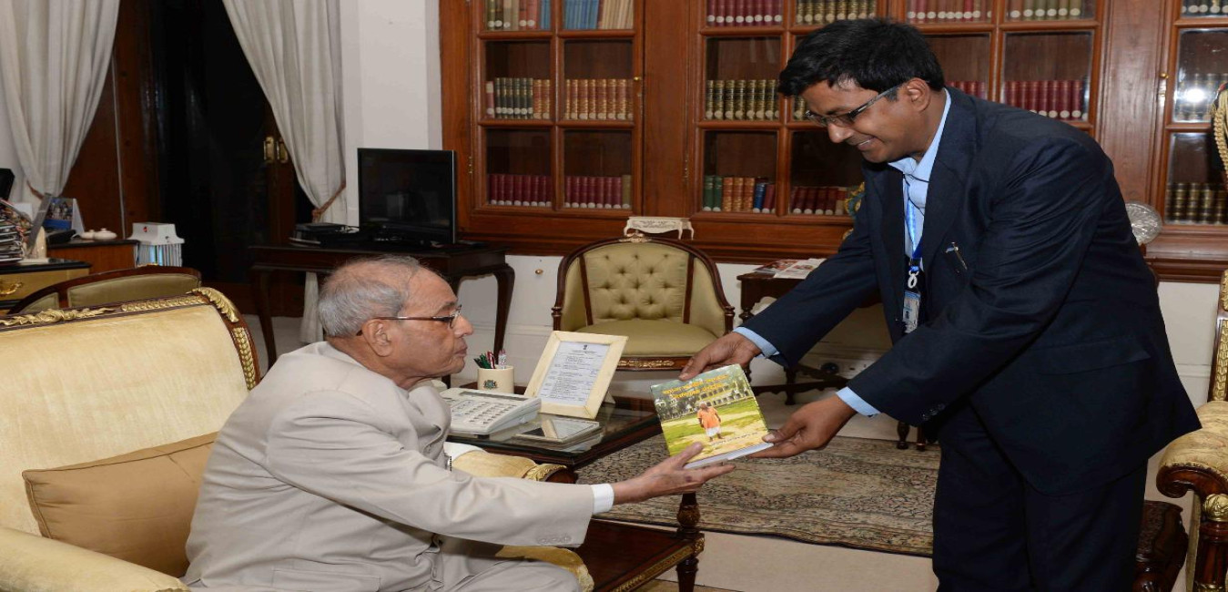 The President of India, Shri Pranab Mukherjee receiving a copy of the book ''Pandit Sir'' from Shri Sukesh Kumar Mandal along with Dr. Kanchan Kumar Bhowmik, at Rashtrapati Bhavan on March 09, 2017.