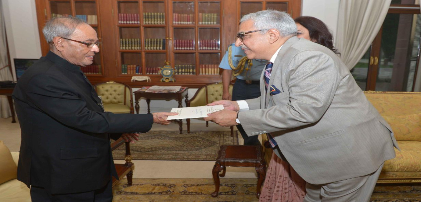 The President of India, Shri Pranab Mukherjee meeting with Dr. Veena Ganju Malla, Hony Physician to the President and Shri RM Malla, former CMD, SIDBI/IDBI, at Rashtrapati Bhavan on April 08, 2016.
