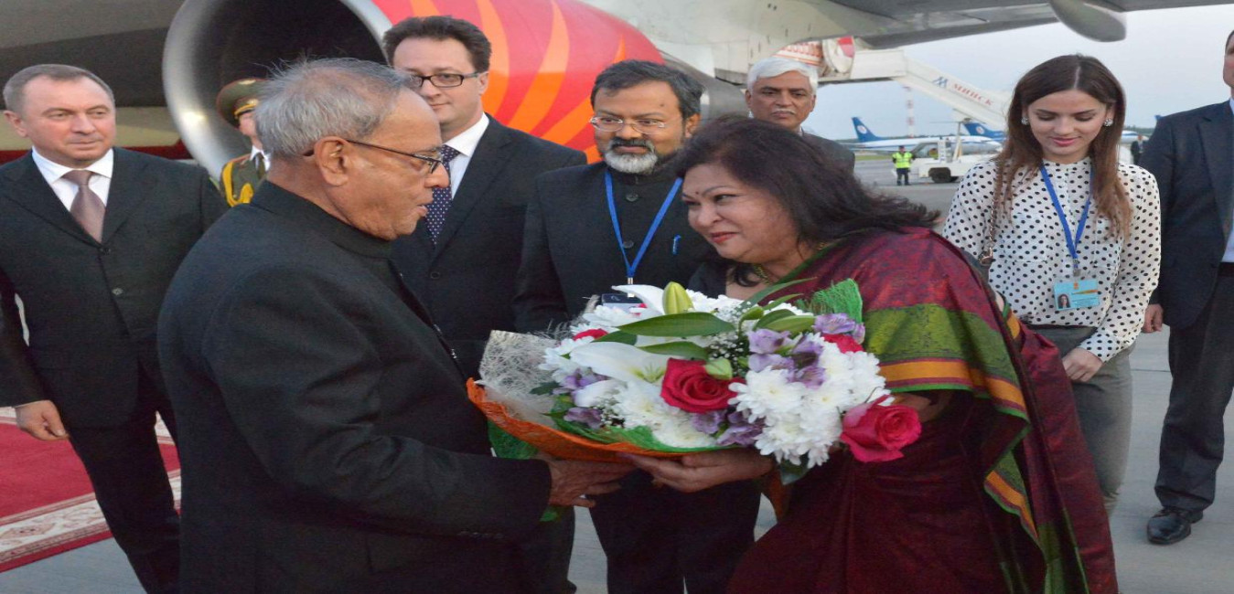 The President of India, Shri Pranab Mukherjee being received by the Deputy Prime Minister of Republic of Belarus, Mr. Vladimir I Semashko, Belarusian Dignitaries and Indian Embassy Officials, on his arrival, at Minsk International Airport, in Republic of Belarus on June 02, 2015.