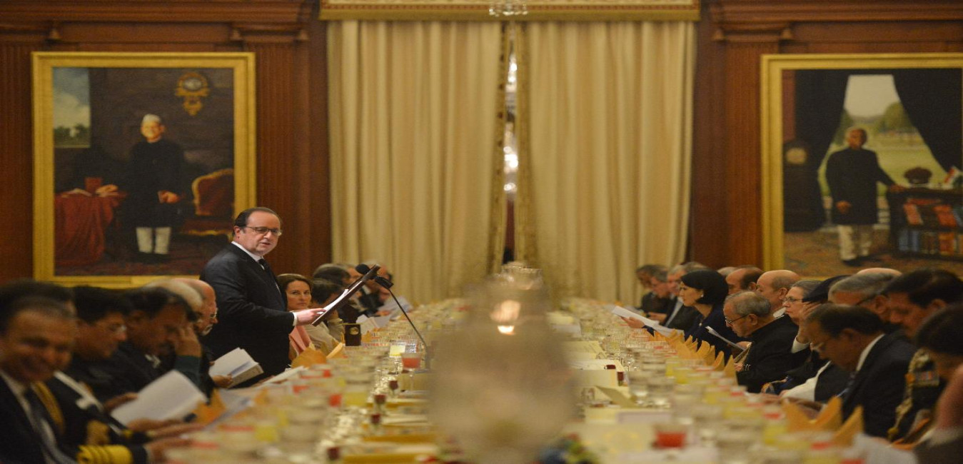 The President of India, Shri Pranab Mukherjee hosting a Banquet in Honour of the President of the French Republic, H.E. Mr. Francois Hollande at Rashtrapati Bhavan on January 25, 2016.