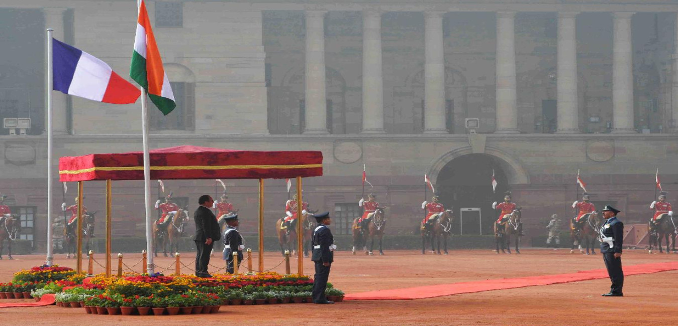 The President of India Shri Pranab Mukherjee receiving the President of the French Republic, H.E. Mr. Francois Hollande during his Ceremonial Reception at the Forecourt of Rashtrapati Bhavan on January 25, 2016.