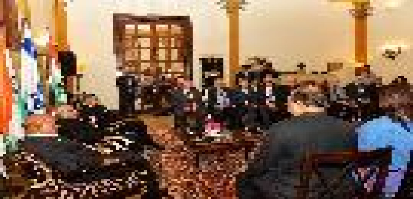 The former President of Israel, Mr. Simon Peres calling on the President of India, Shri Pranab Mukherjee along with his official delegation members, at Hotel David, Jerusalem in Israel on October 14, 2015.
