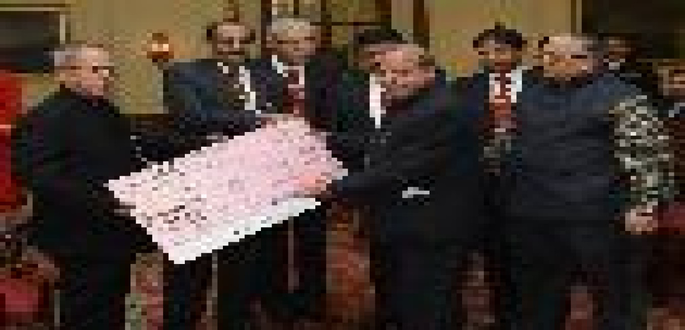 The President of India, Shri Pranab Mukherjee receiving a copy of the Book Entitled 'Shri Ramayana Mahnveshanam' (in two volumes) of the Union Minister of Petrolium and Natural Gas and Environment and Forests, Shri M Veerappa Moily at Vigyan Bhavan in New Delhi on Feb 03, 2014