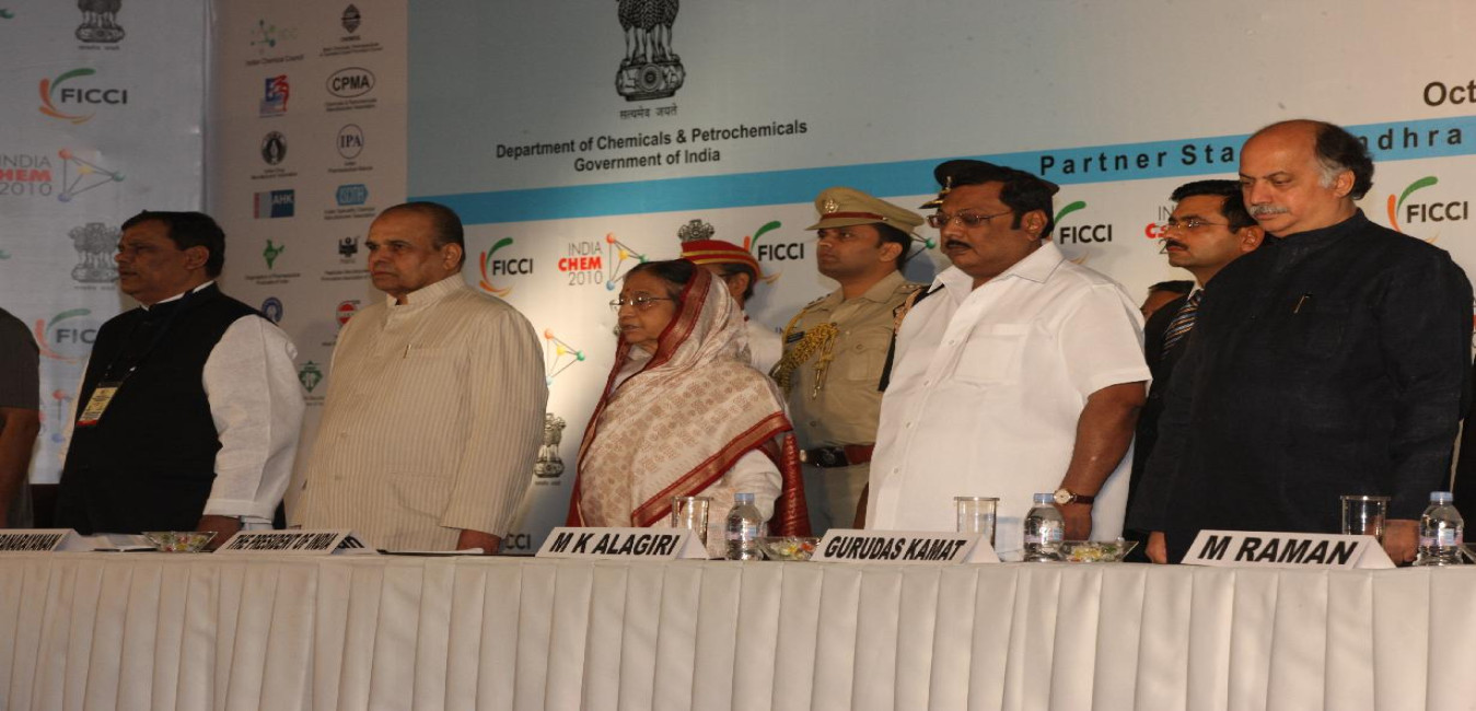 The President of India, Smt Pratibha Devisingh Patil during the Inauguration of the 'India-Chem 2010' International Exhibition and Conference and receiving a Copy of the Handbook on 'Indian Chemical Industry' from the Minister of Chemicals and Fertilizers, Dr M K Alagiri at Mumbai in Maharashtra on Oct 28, 2010