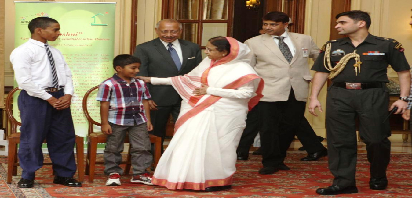The President of India, Smt Pratibha Devisingh Patil with the winner of the 'Roshni' Logo Competition, Master Robin Singh (to the left) and the winner of the Encouragment Prize, Master Vibhu Prakash (to the right) at Rashtrapati Bhavan in New Delhi on June 05, 2012