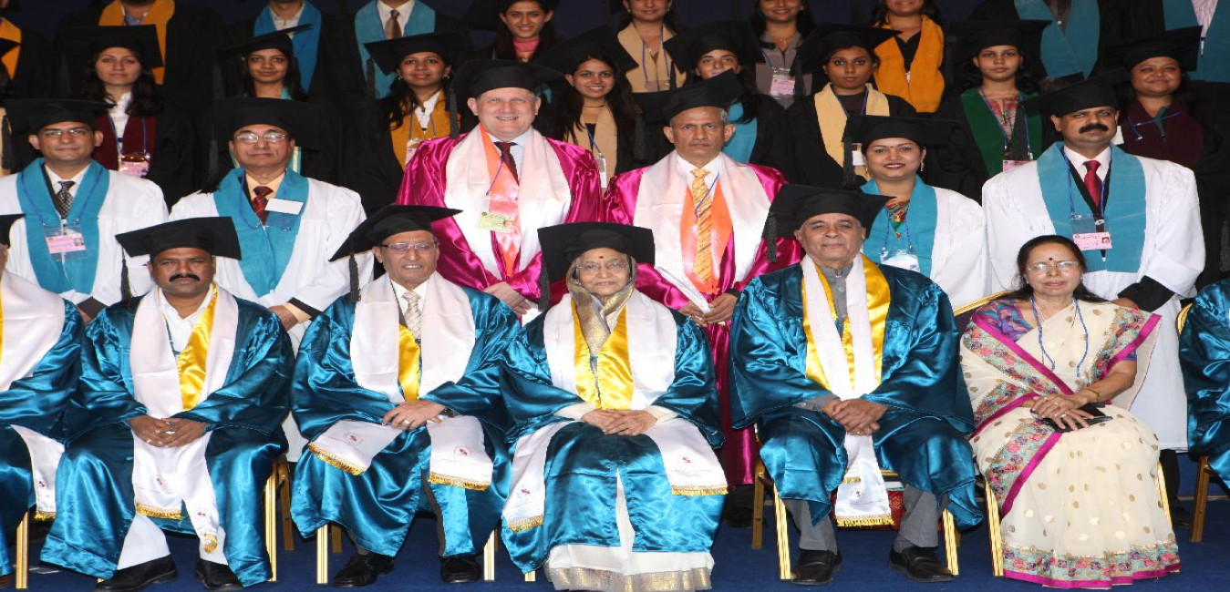 The President of India, Smt Pratibha Devisingh Patil during the 8th Convocation of the University and receiving the Flag of the United Nations from the Chancellor of the Symbiosis International University, Dr S B Mujumdar at Pune in Maharashtra on Dec 03, 2011