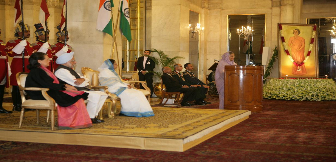 The President of India, Smt Pratibha Devisingh Patil presenting the Indira Gandhi Prize for Peace, Disarmament and Development 2009 to the Prime Minister of the People's Republic of Bangladesh, HE Mrs Sheikh Hasina at Rashtrapati Bhavan in New Delhi on Jan 12, 2010