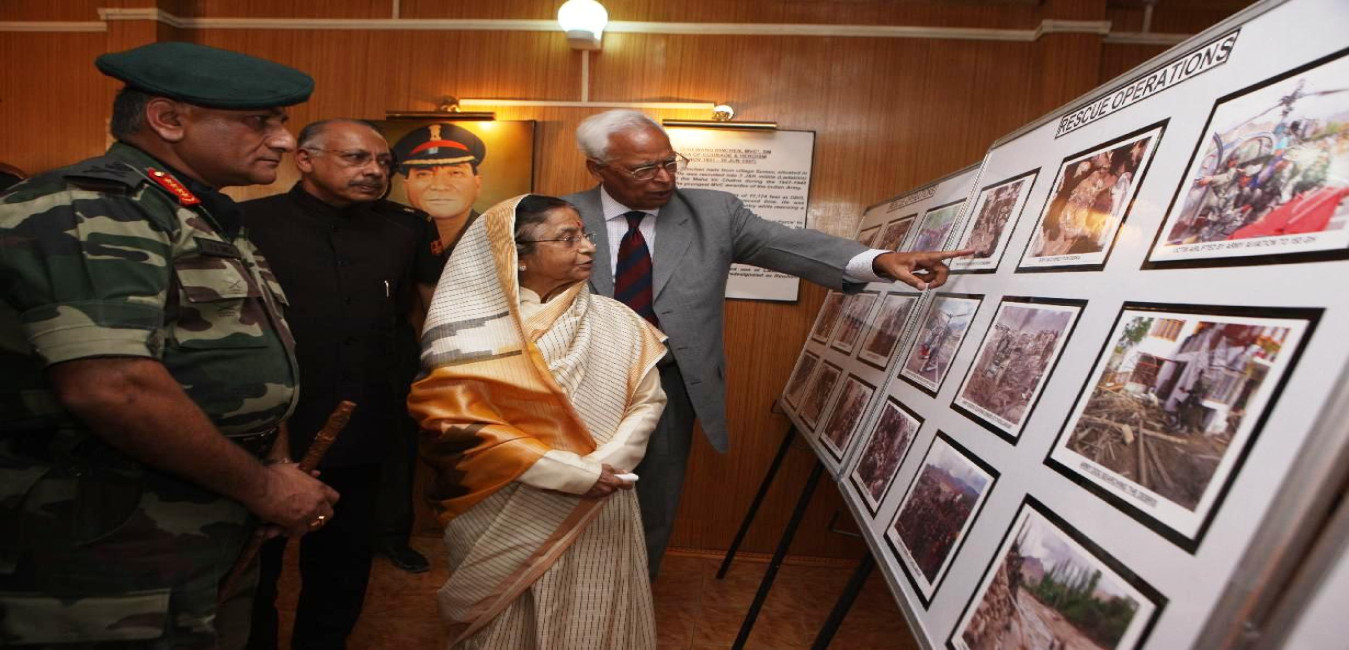 The President of India, Smt Pratibha Devisingh Patil seeing the Rescue Operation Photographs of the Areas Affected by the Cloudburst at Leh in Jammu & Kashmir on Sep 01, 2010