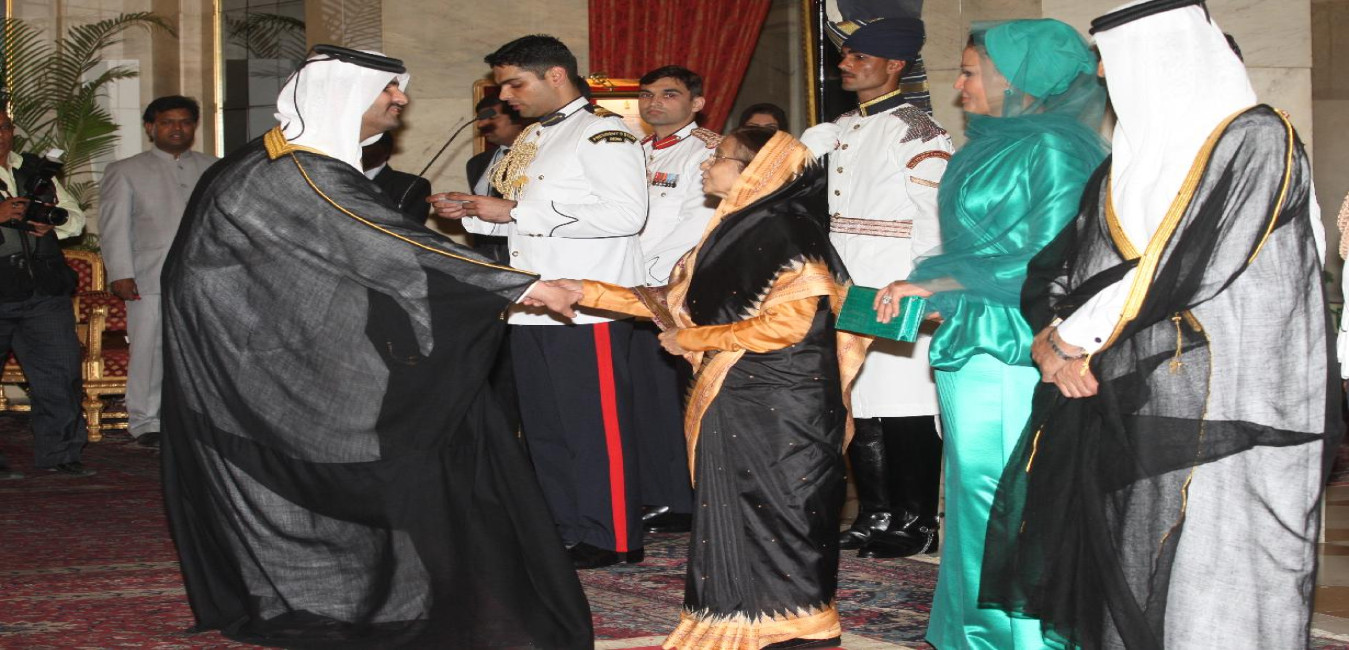 The Emir of the State of Qatar, His Highness Sheikh Hamad Bin Khalifa Al-Thani calling on the President of India, Smt Pratibha Devisingh Patil at Rashtrapati Bhavan in New Delhi on April 09, 2012
