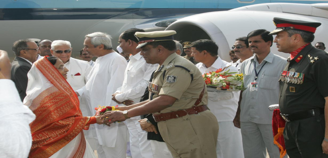 The President of India, Smt Pratibha Devisingh Patil being welcomed by the Governor of Odisha, Shri Murlidhar Chandrakant Bhandare and the Chief Minister of Odisha, Shri Naveen Patnaik at Bhubaneswar Airport in Odisha on Dec 08, 2009