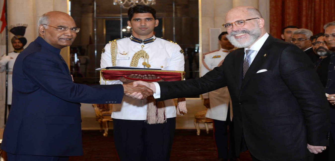 The Ambassador-designate of Uruguay, H.E. Mr. Alvaro A. Malmierca presenting his credentials to the President of India, Shri Ram Nath Kovind, at Rashtrapati Bhavan on July 11, 2018.
