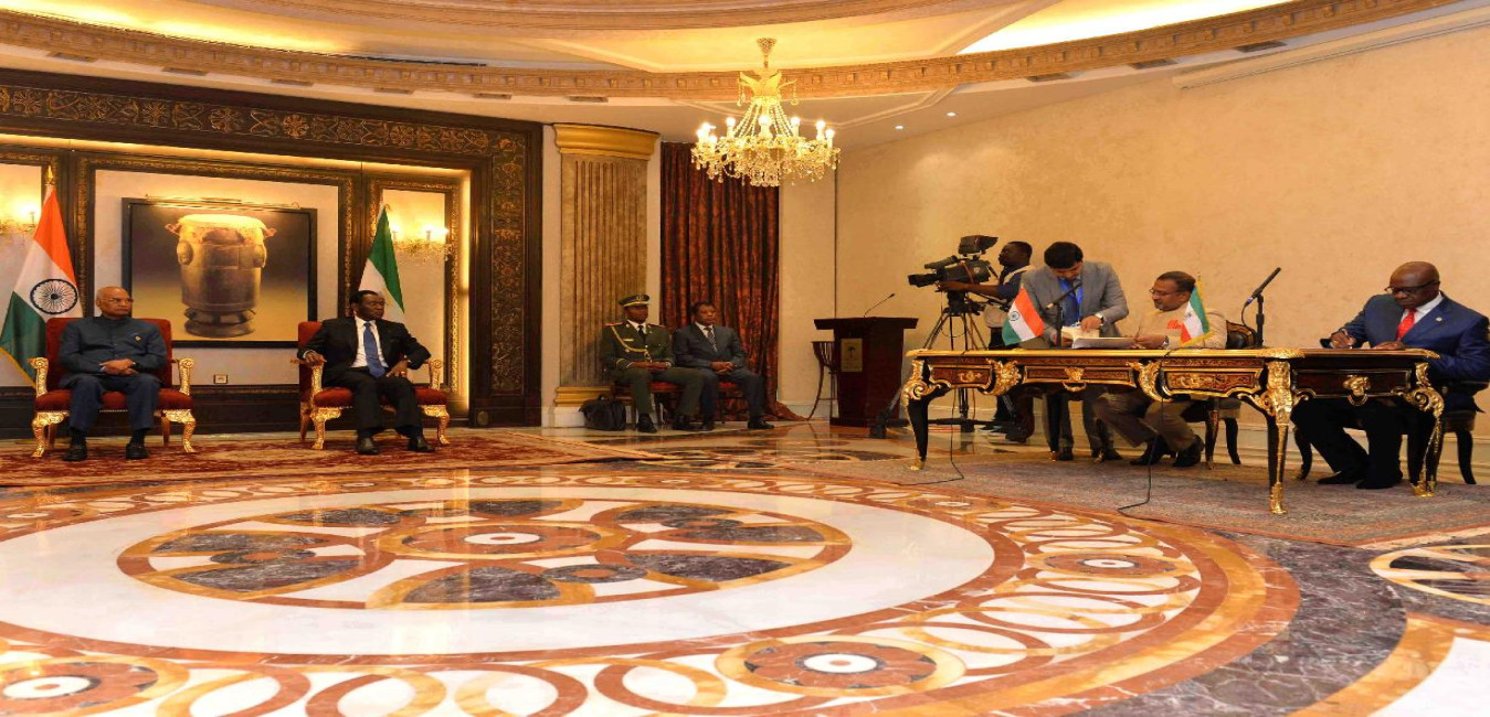 The President of India, Shri Ram Nath Kovind and the President of the Republic of Equatorial Guinea, H.E. Mr. Obiang Nguema Mbasogo witnessing various signing of agreements, at Presidential Palace, in the Republic of Equatorial Guinea on April 08, 2018.