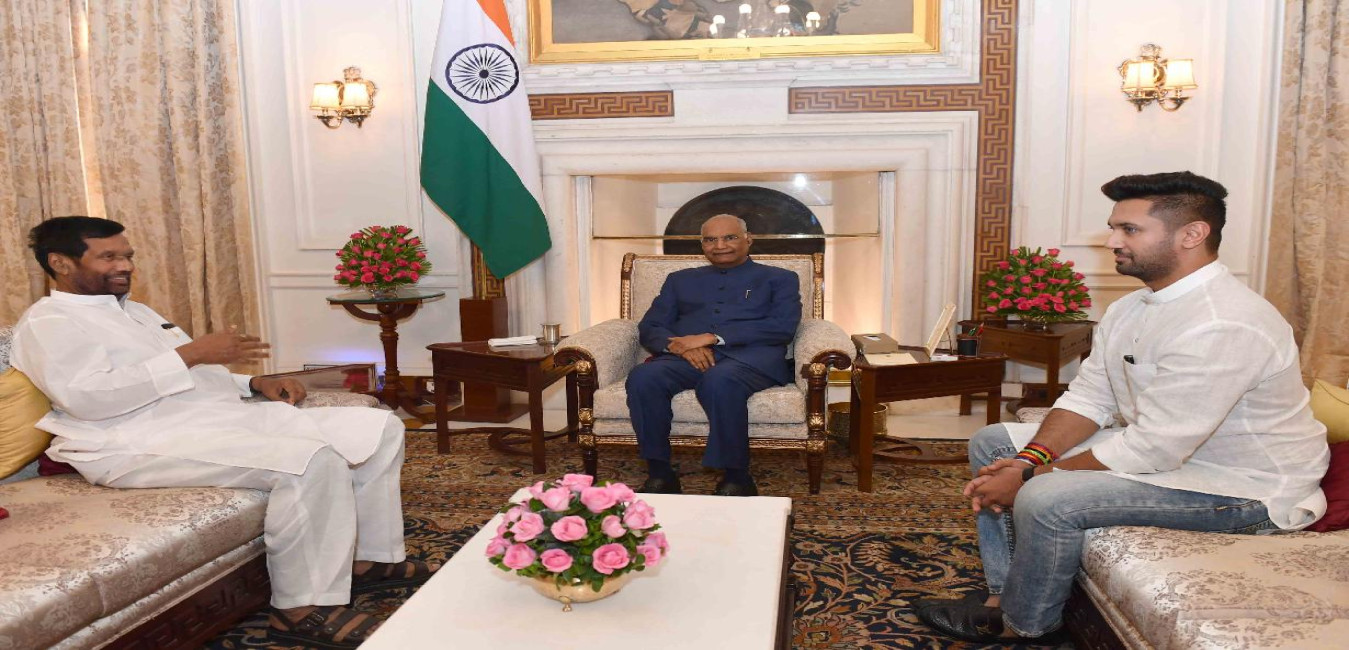 The Minister of Consumer Affairs, Food and Public Distribution, Shri Ramvilas Paswan along with his son Shri Chirag Paswan, MP (LS) meeting with the President of India, Shri Ram Nath Kovind, at Rashtrapati Bhavan on June 10, 2019.