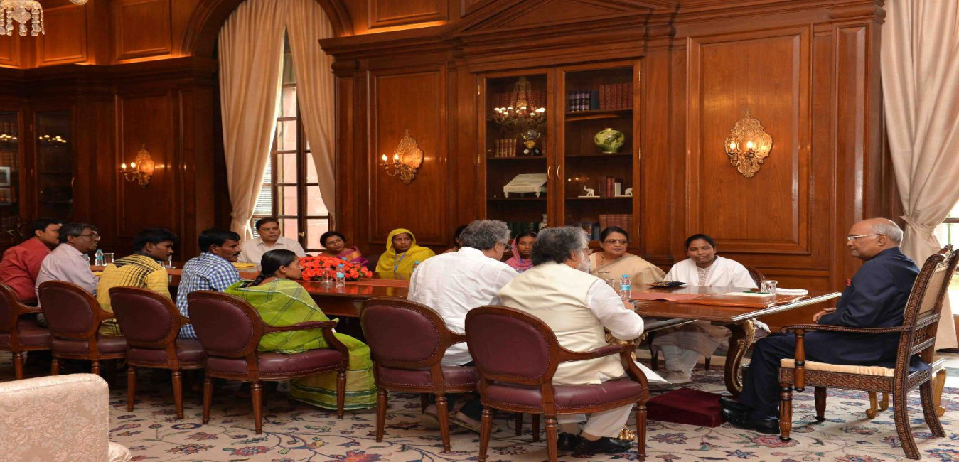 Shri Sudip Bandyopadhyay, MP (LS) & Leader, All India Trinamool Congress (AITC), Shri Derek O' Brien, MP (RS) & Leader, AITC Parliamentary Party in Rajya Sabha along with MPs of AITC and Trinamool workers meeting with the President of India, Shri Ram Nath Kovind, at Rashtrapati Bhavan on May 03, 2018.