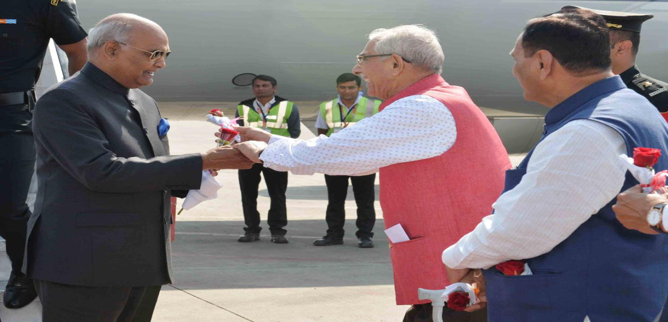 The President of India, Shri Ram Nath Kovind being received by the Governor of Gujarat, Shri Om Prakash Kohli and the Chief Minister of Gujarat, Shri Vijay Rupani, on his arrival, at Ahmedabad airport on January 21, 2018.