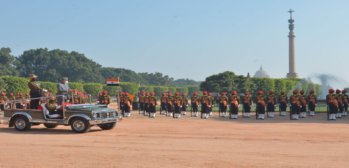 The President of India, Shri Ram Nath Kovind witnessing the ceremonial change-over of the Army Guard Battalion stationed at Rashtrapati Bhavan on November 28, 2020. The 5th Battalion of the 1st Gorkha Rifles handed over the charge to the 6th Battalion of the Sikh Regiment.