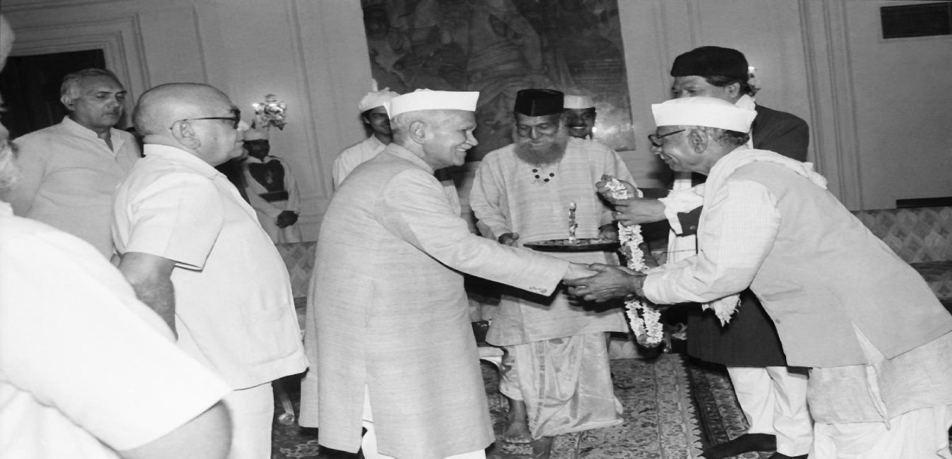 The President of India, Dr. Shankar Dayal Sharma meeting with Shri Babulal Azad with others from All India Sarwa Dharma Sadbhavana Ekta Committee, Bhopal at Rashtrapati Bhavan in New Delhi on September 08, 1994.