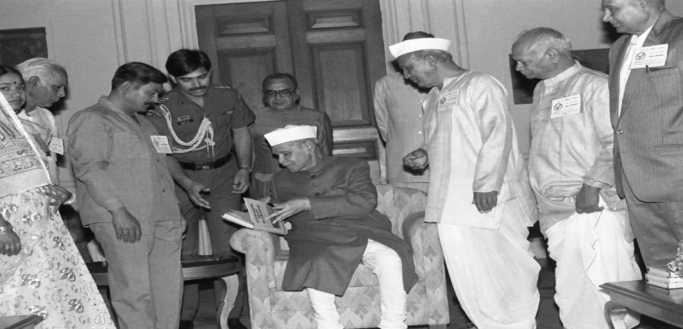 The President of India, Dr. Shankar Dayal Sharma receiving a copy of the book "Bharatiya Adhunik Rajbhasha: Swarup Aur Samasyain" of Dilip Kumar Chauhan of Indore at Rashtrapati Bhavan in New Delhi on March 22, 1994.