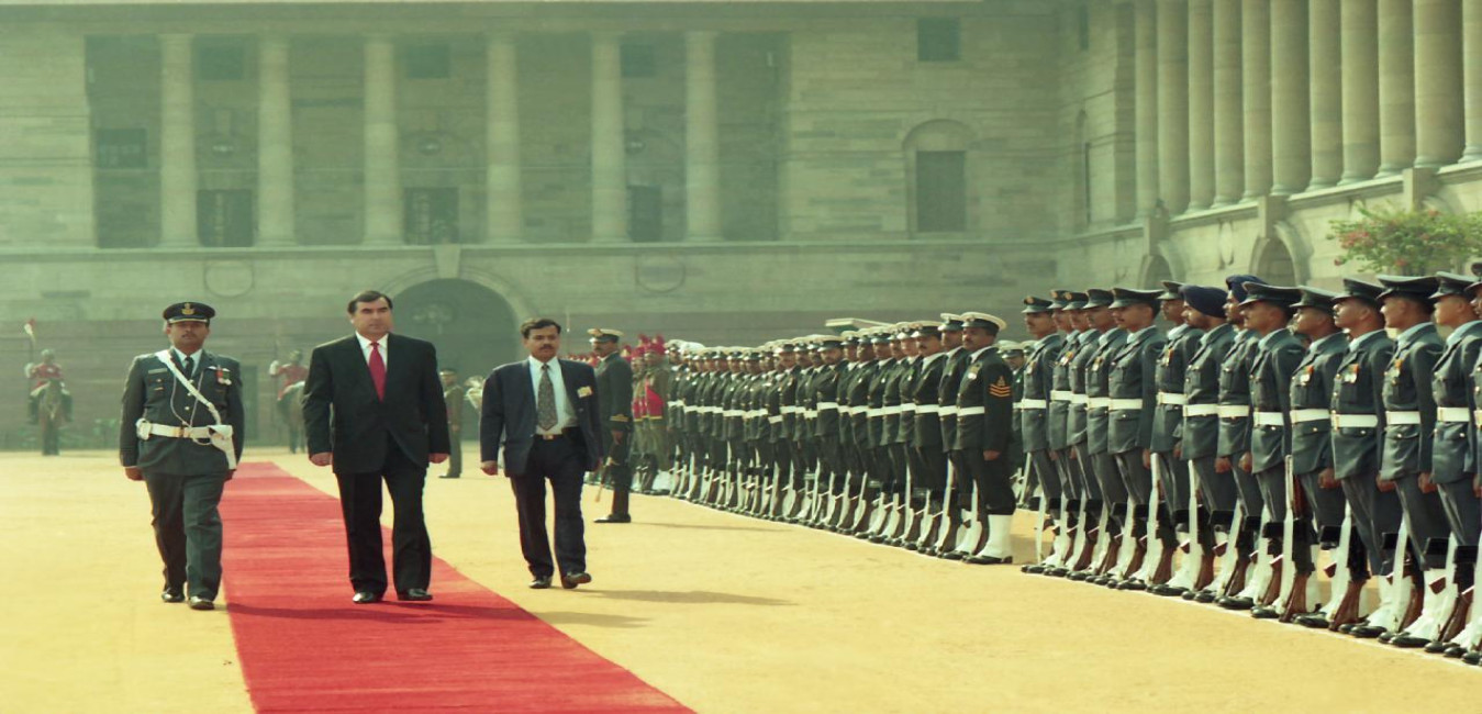 The President of India, Dr. Shankar Dayal Sharma receiving H.E. Mr. Emomali Sharipovich Rakhmonov, President of the Republic of Tajikistan, at the Ceremonial Reception, at Rashtrapati Bhavan in New Delhi on December 11, 1995.