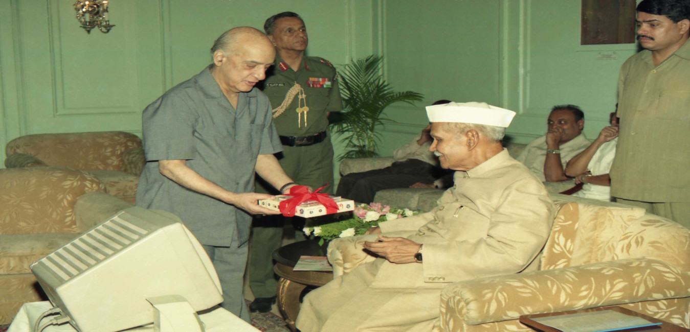 The President of India, Dr. Shankar Dayal Sharma receiving a Multimedia CD-ROM title "Gandhi-Apostle of Peace & Nonviolence" from Shri N. Balasubramaniyan at Rashtrapati Bhavan in New Delhi on October 02, 1996.