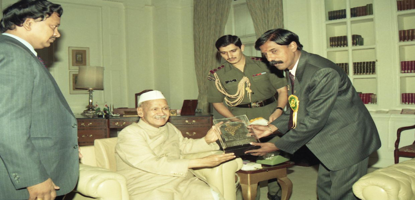 The President of India, Dr. Shankar Dayal Sharma meeting with Shri N. Manoharan, Regional Chairman of the Lions Clubs International, Coimbatore with others at Rashtrapati Bhavan in New Delhi on August 21, 1995.