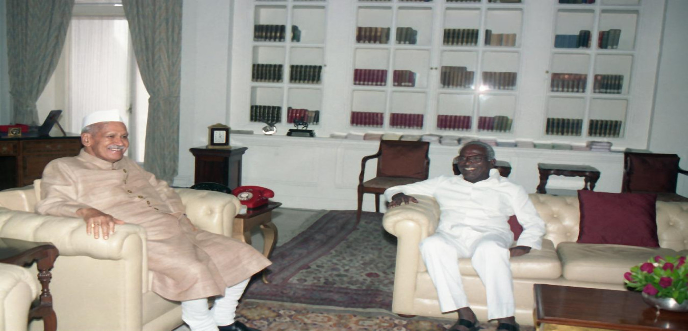 The President of India, Dr. Shankar Dayal Sharma meeting with Shri P. Shiv Shankar, Governor designate to Sikkim at Rashtrapati Bhavan in New Delhi on September 19, 1994.