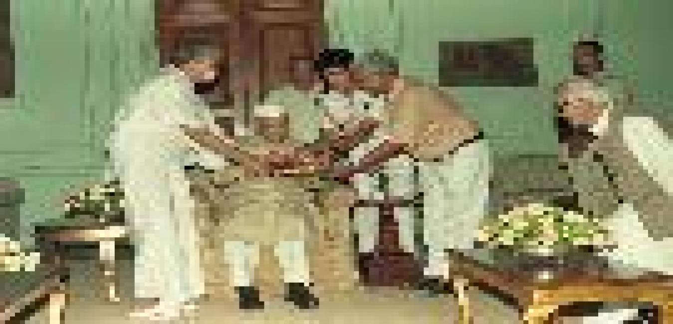 The President of India, Dr. Shankar Dayal Sharma receiving a copy of Book "Dev Kumar Jain Smriti Granth" from Shri Udaibhanu Hans and others at Rashtrapati Bhavan in New Delhi on June 14, 1997.