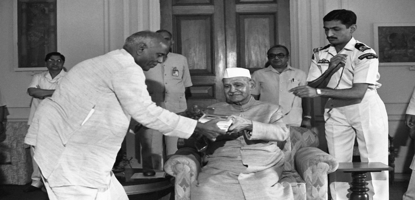 The President of India, Dr. Shankar Dayal Sharma receiving a set of the books "Bharat Ke Pradhan Mantri, Shri Narasimha Rao Vyaktitva Avam Krititva" (in five languages) from Shri Vemuri Radhakrishna Murty at Rashtrapati Bhavan in New Delhi on August 24, 1994.
