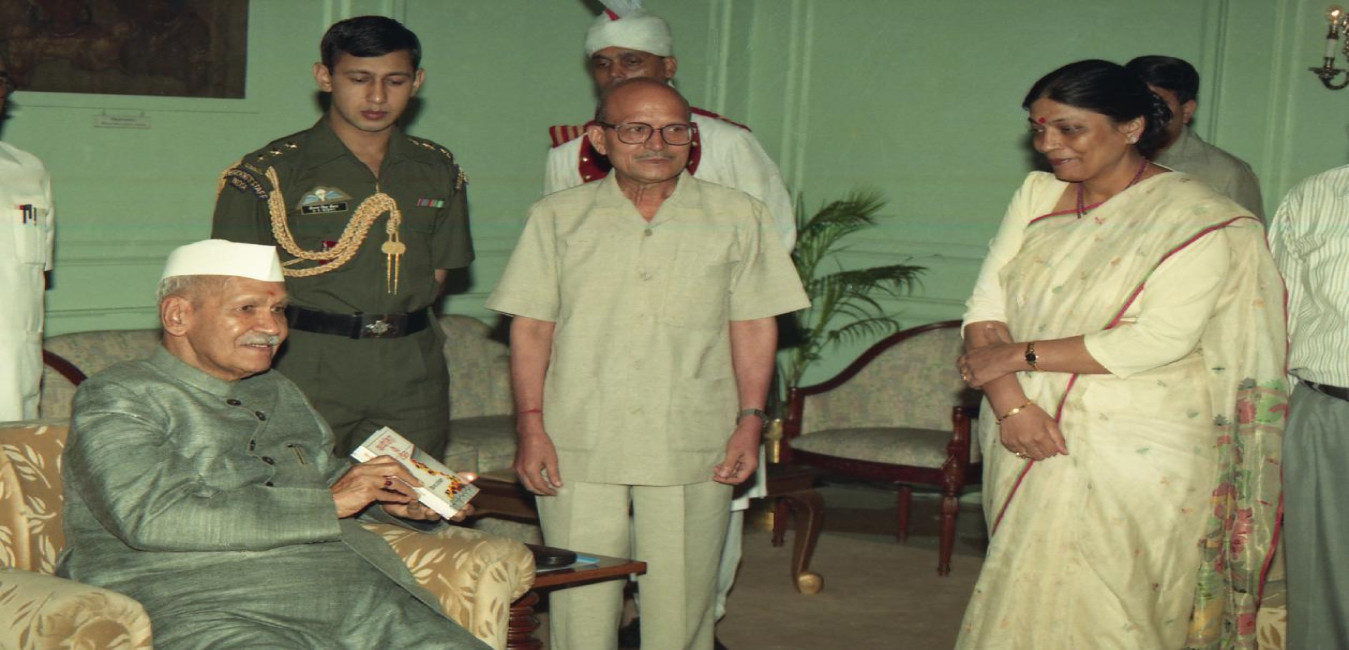 The President of India, Dr. Shankar Dayal Sharma receiving a copy of the book "Kachi Mitti Ke Log" from Smt. Vijaya Goel at Rashtrapati Bhavan in New Delhi on September 12, 1996.