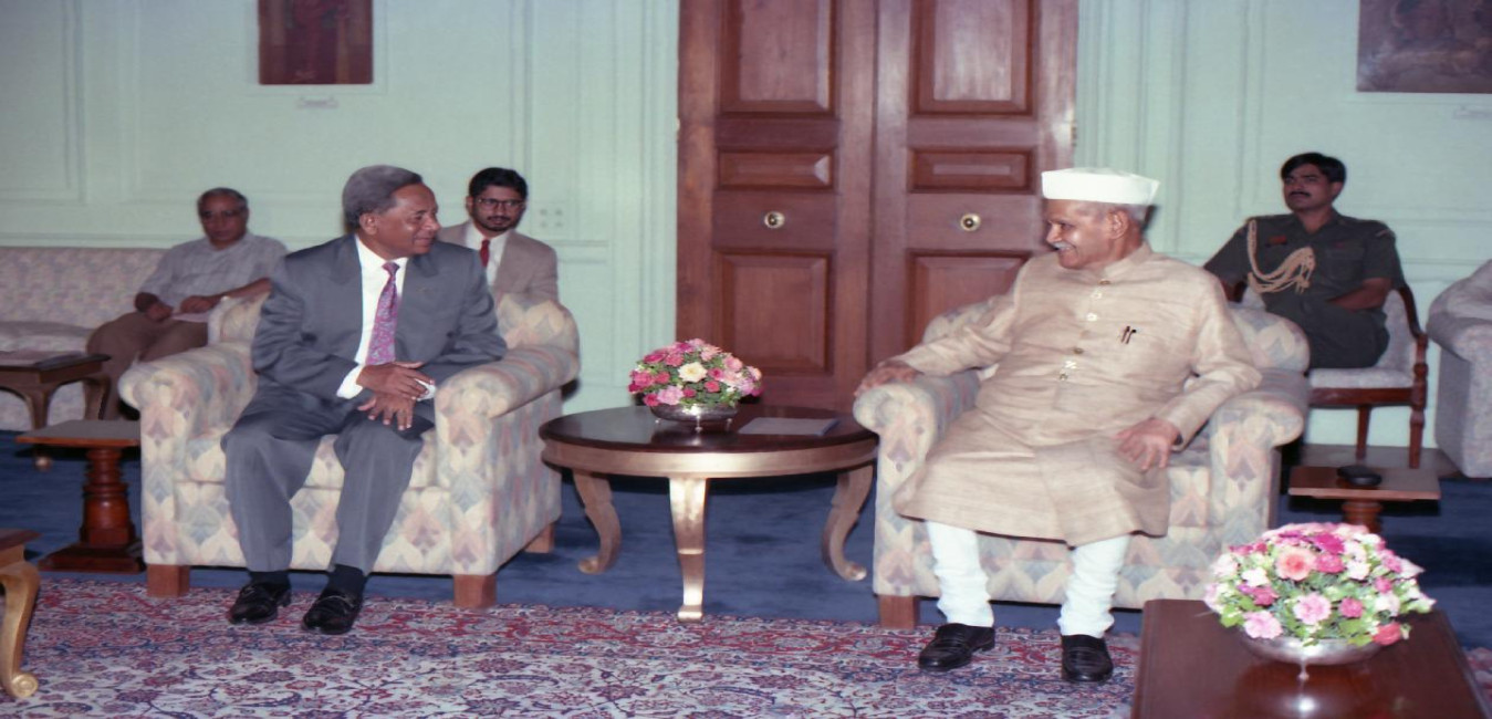 A Namibian Parliamentary Delegation led by H.E. Mr. Kandy Nehova, Chairman of the National Council calling on the President of India, Dr. Shankar Dayal Sharma at Rashtrapati Bhavan in New Delhi on August 11, 1994.