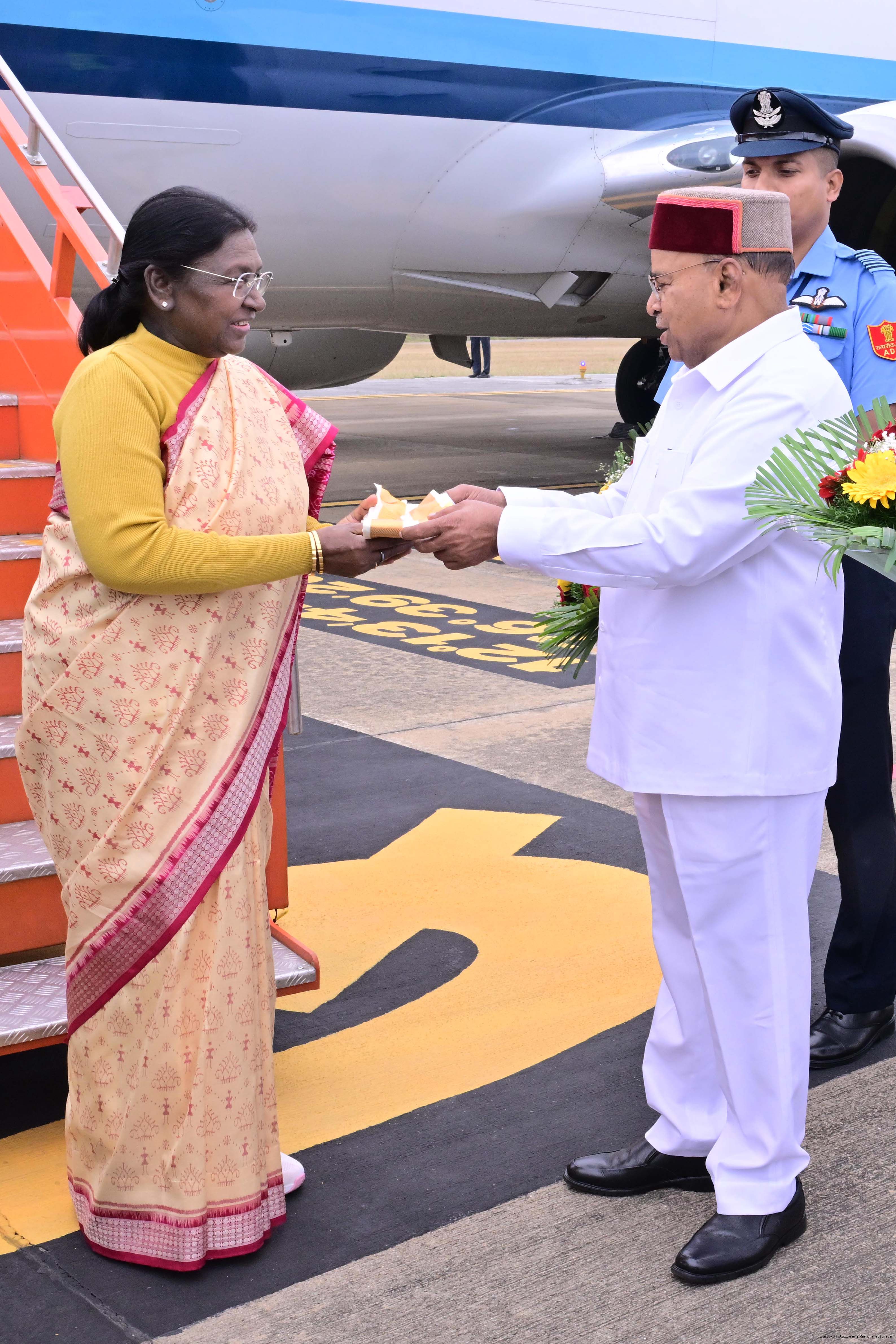 The Governor of Karnataka, Shri Thaawar Chand Gehlot and Union Minister for Heavy Industries and Steel, Shri H. D. Kumaraswamy received the President of India, Smt. Droupadi Murmu on her arrival at Mysuru, Karnataka on December 16, 2025.