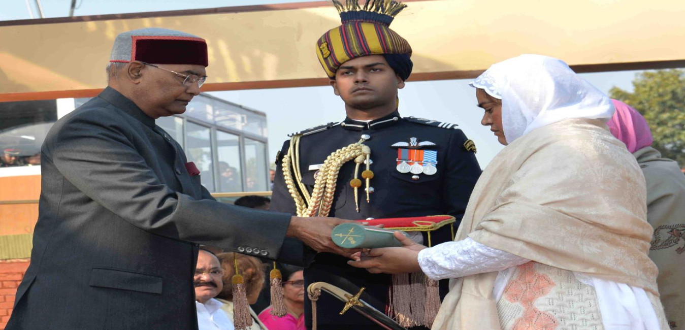 The President of India, Shri Ram Nath Kovind presenting the Ashok Chakra posthumously to Lance Naik Nazir Ahmad Wani, at the 70th Republic Day Parade, at Rajpath, in New Delhi on January 26, 2019. The award received by his Wife and Mother.