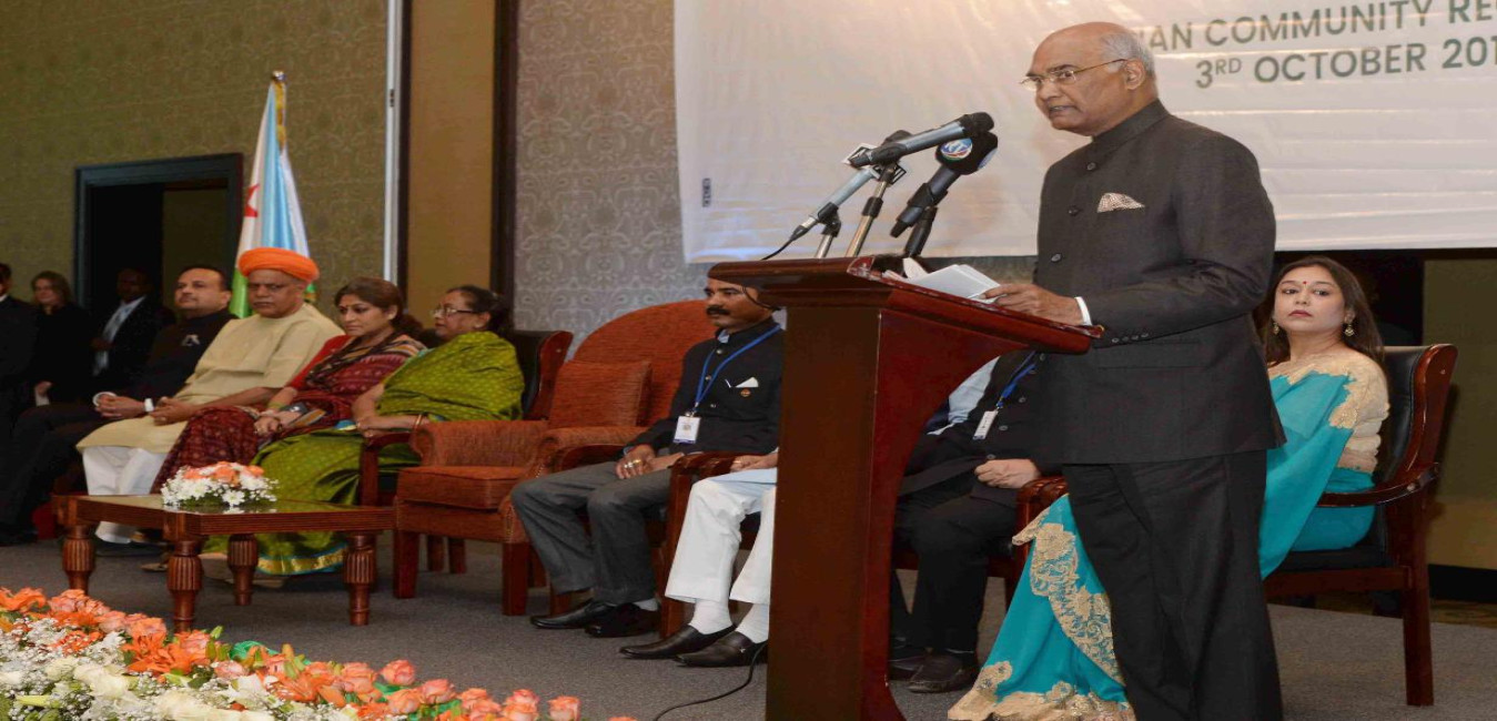 The President of India, Shri Ram Nath Kovind addressing at the Indian Community Reception, hosted by the Ambassador of India to Djibouti, Shri Anurag Srivastava, in Djibouti on October 03, 2017.