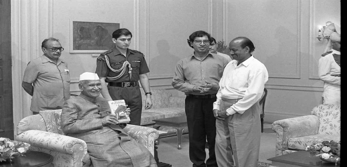 The President of India, Dr. Shankar Dayal Sharma receiving a copy of the Atlas "Uttar Pradesh Ka Boli-Bhoogol" from Dr. Kailash Chander Aggarwal at Rashtrapati Bhavan in New Delhi on August 07, 1996.