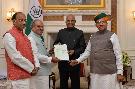 An NDA delegation, led by Shri Amit Shah, President, BJP, and comprising Shri Prakash Singh Badal, Shri Rajnath Singh, Shri Nitish Kumar, Shri Ram Vilas Paswan, Smt. Sushma Swaraj, Shri Uddhav Thakeray, Shri Nitin Gadkari, Shri K. Palaniswami, Shri Conrad Sangma and Shri Neiphiu Rio calling on the President of India, Shri Ram Nath Kovind, at Rashtrapati Bhavan on May 25, 2019.