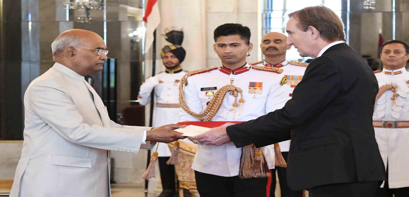 The Ambassador-designate of Iceland, H.E. Mr. Gudmundur Arni Stefansson presenting his credentials to the President of India, Shri Ram Nath Kovind, at Rashtrapati Bhavan on September 20, 2018.