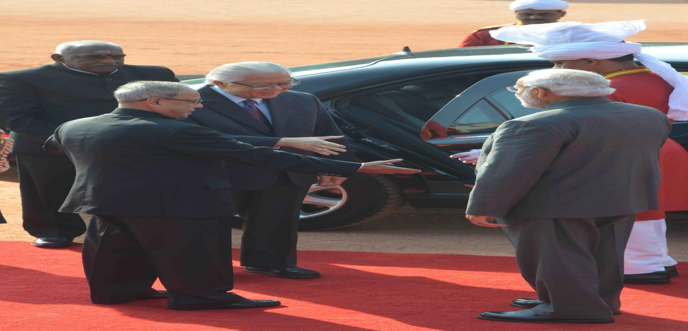 The President of India, Shri Pranab Mukherjee receiving the President of the United States of America, HE Mr Barack Obama during his Ceremonial Reception at the forecourt of Rashtrapati Bhavan, in New Delhi on January 25, 2015.