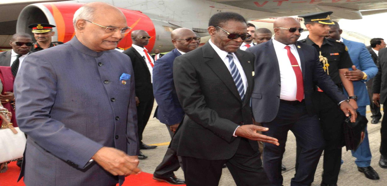 The President of India, Shri Ram Nath Kovind being received by the President of the Republic of Equatorial Guinea, H.E. Mr. Obiang Nguema Mbasogo and other dignitaries, on his arrival, at Malabo International Airport, in the Republic of Equatorial Guinea on April 07, 2018.