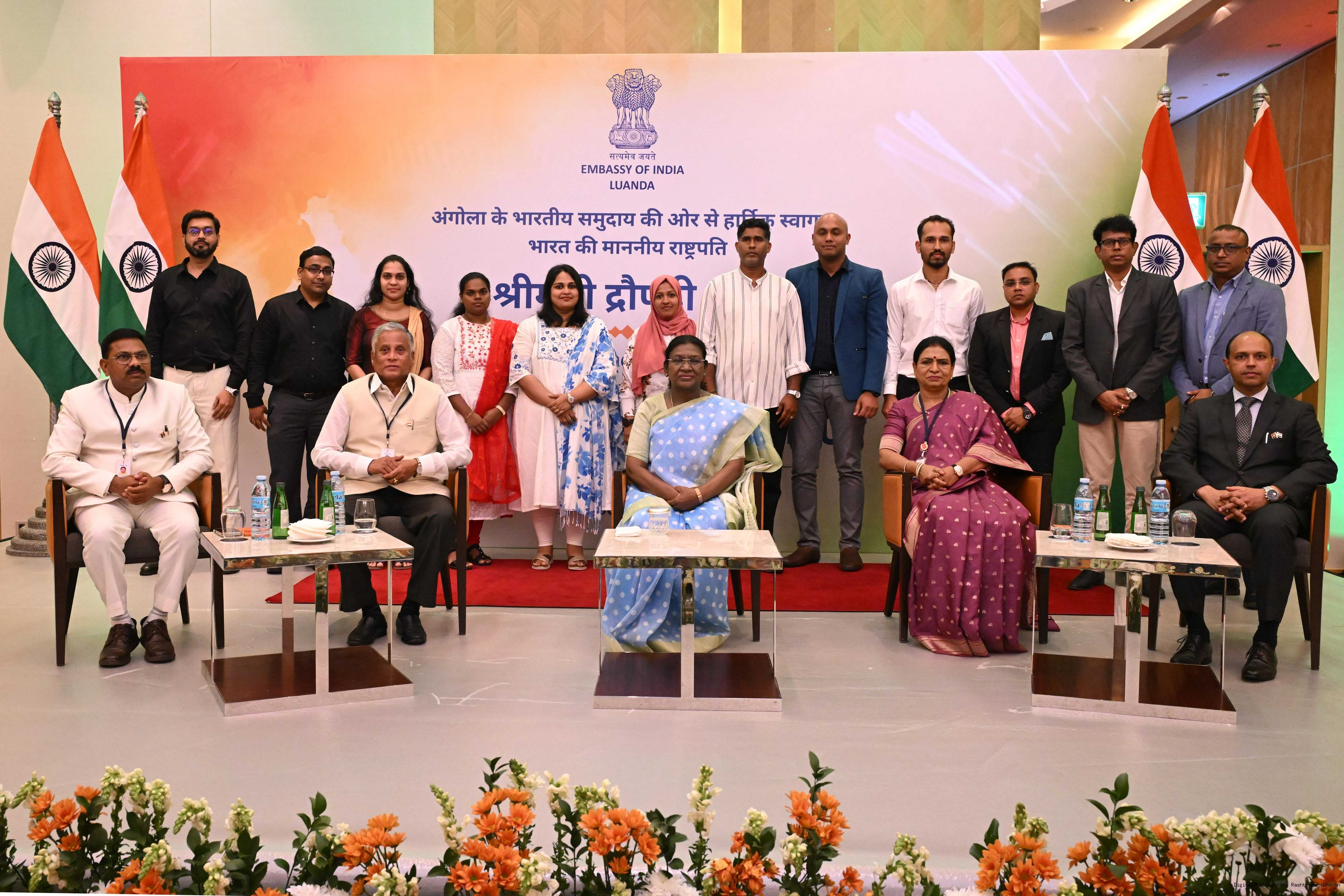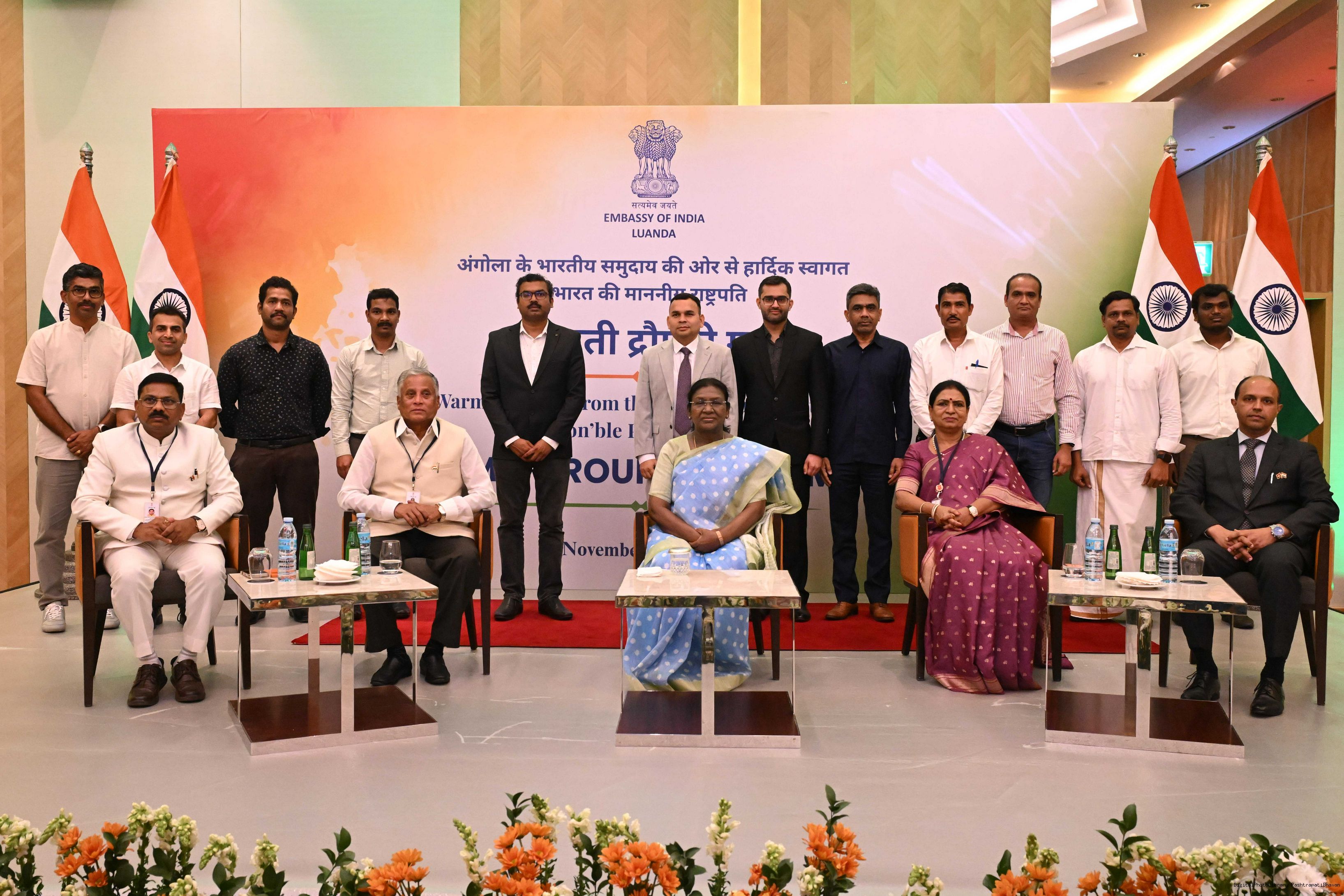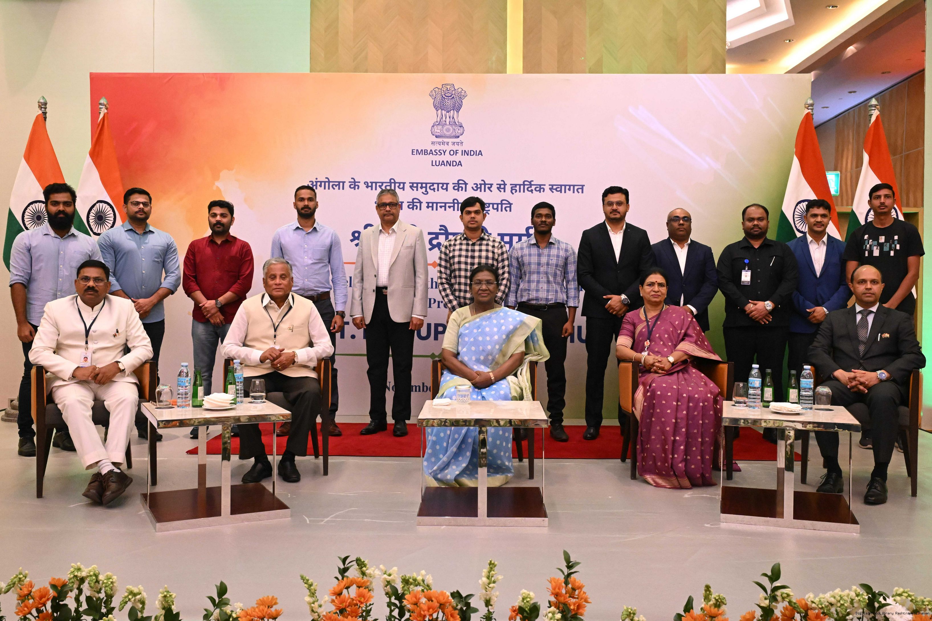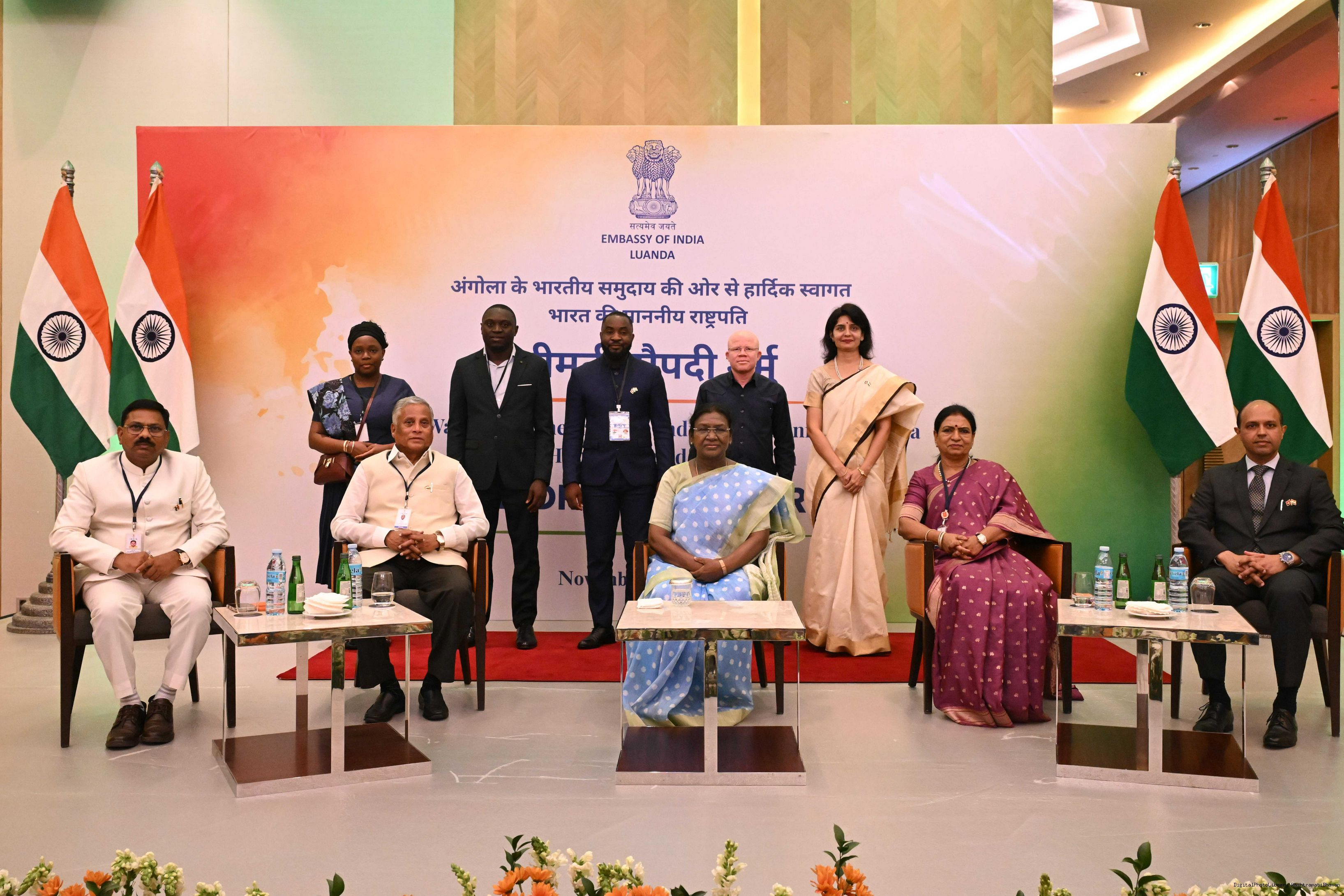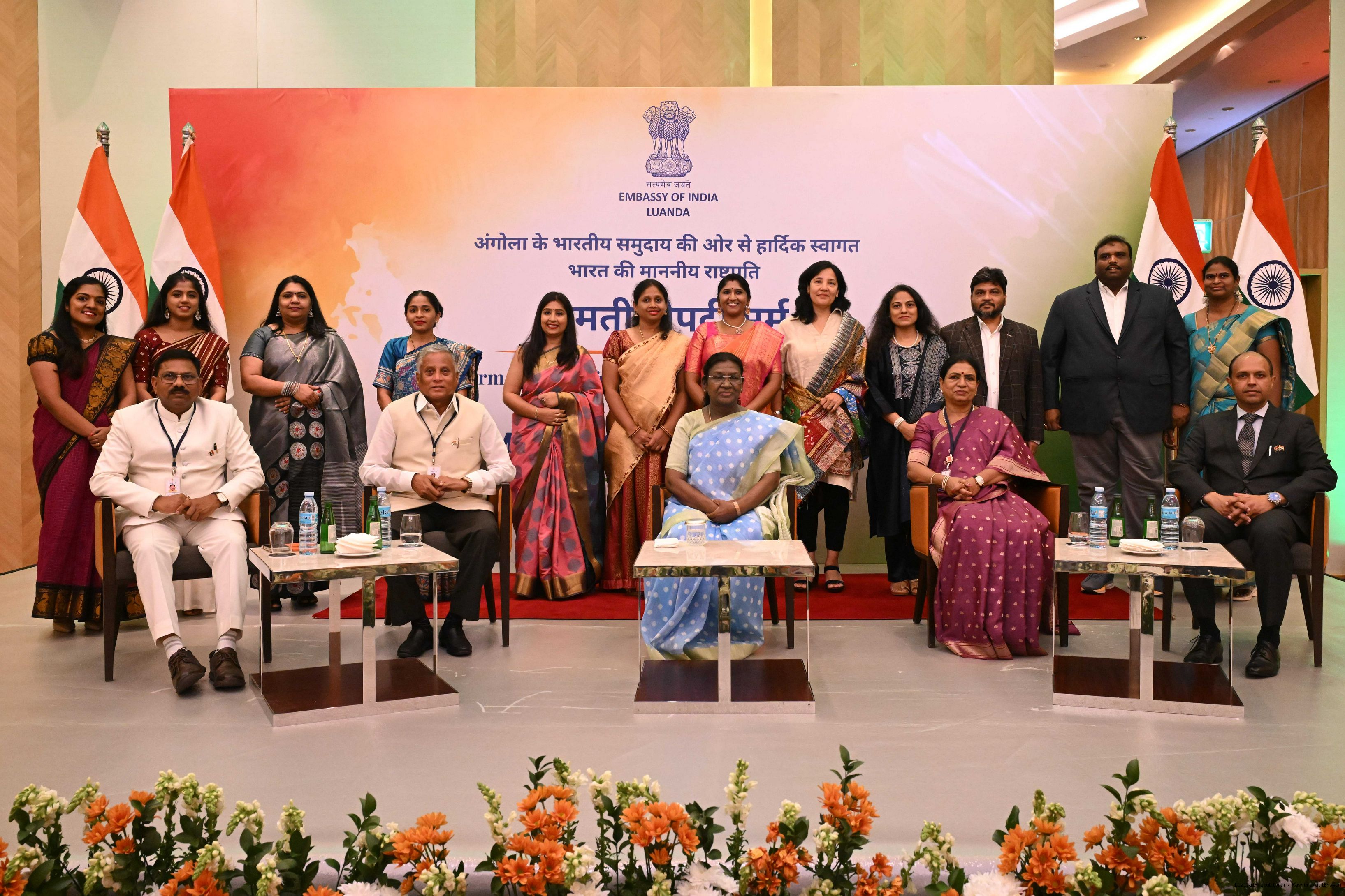 Caption: The President of India, Smt. Droupadi Murmu addressed the members of the Indian Community at a Reception hosted by the Ambassador of India to Angola at Luanda on November 10, 2025.