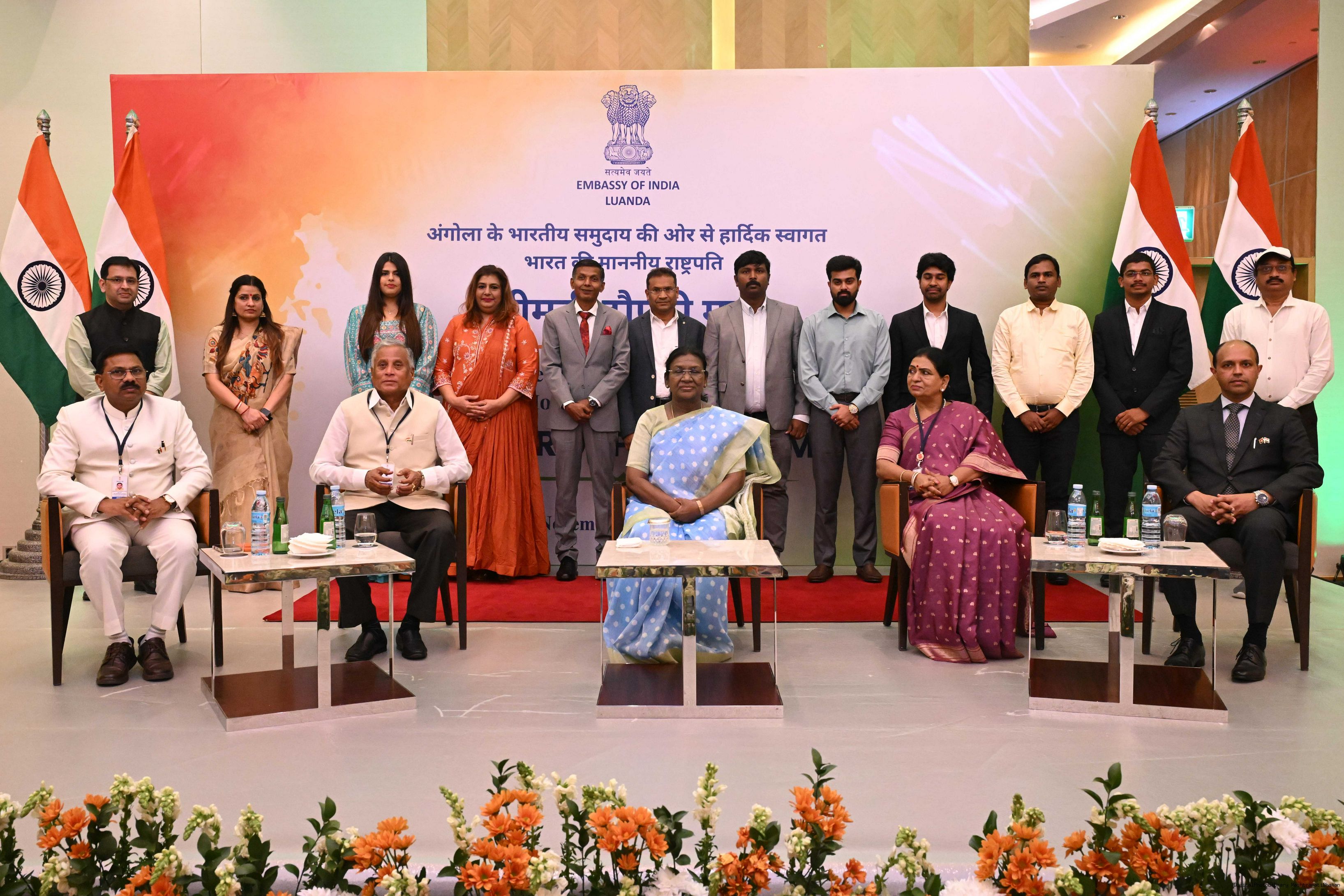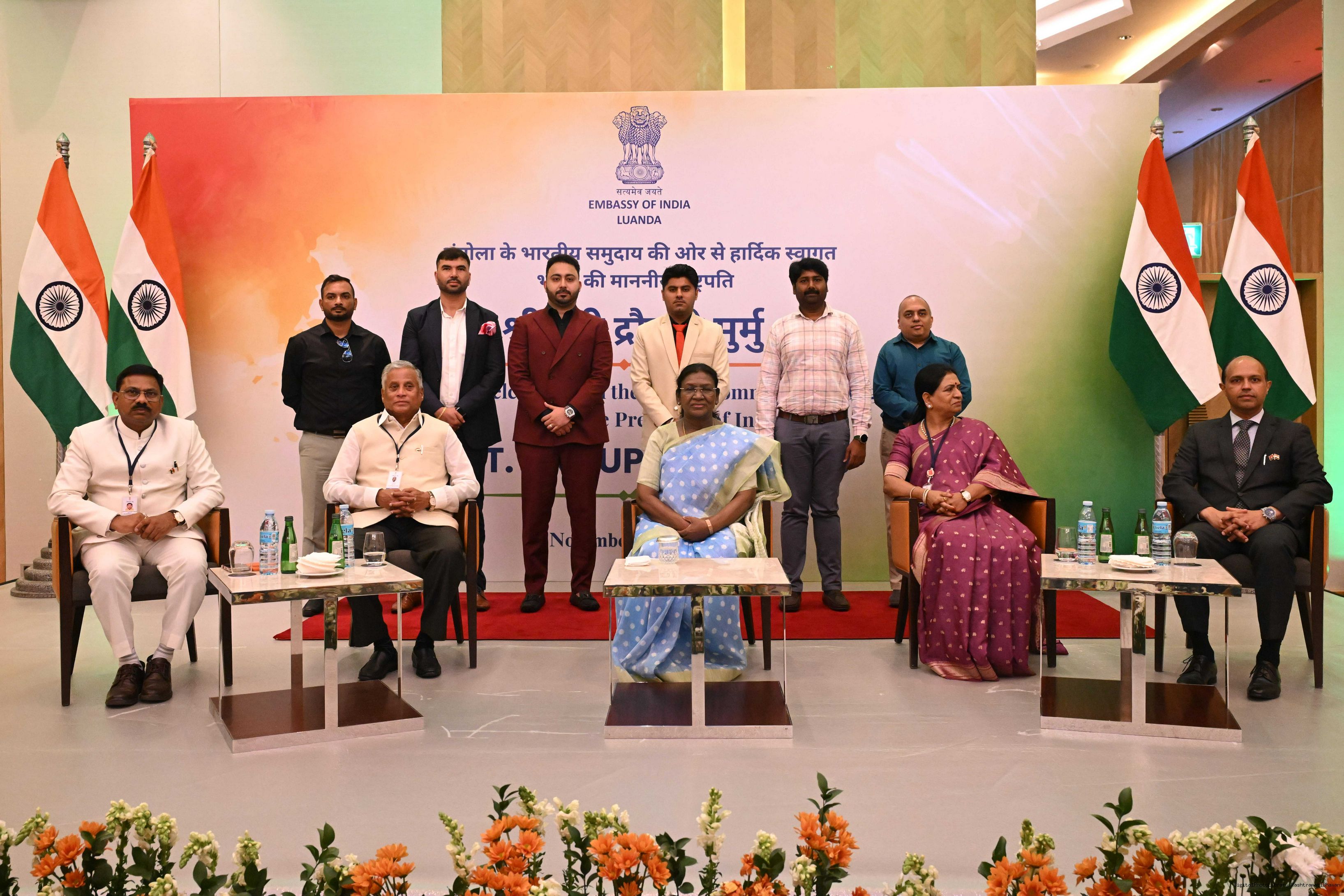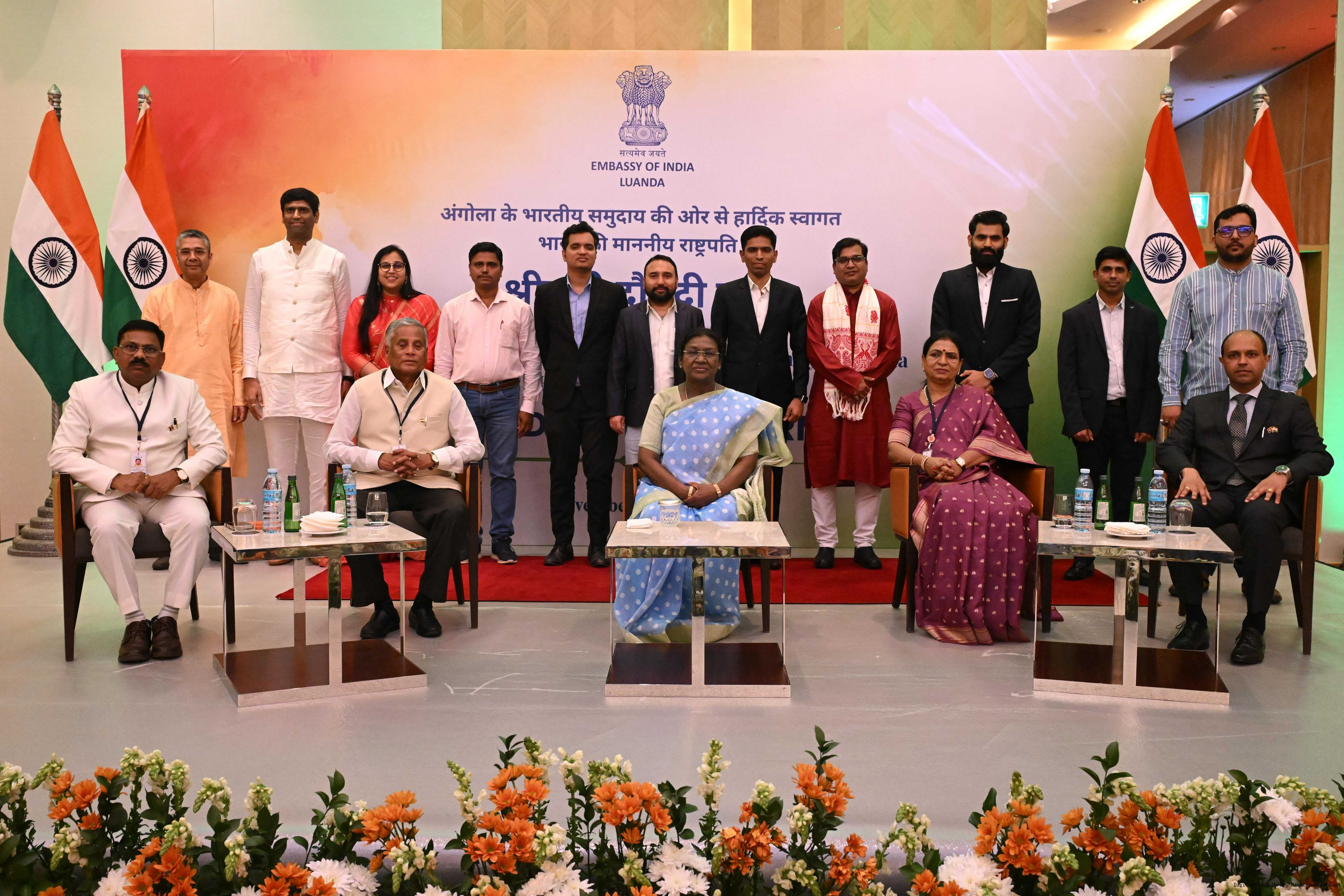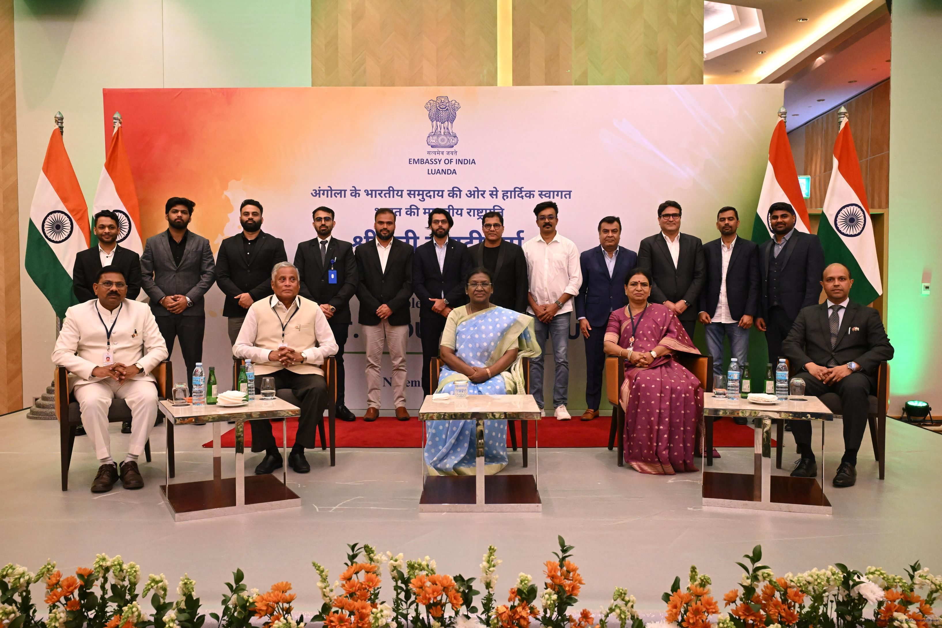 Caption: The President of India, Smt. Droupadi Murmu addressed the members of the Indian Community at a Reception hosted by the Ambassador of India to Angola at Luanda on November 10, 2025.