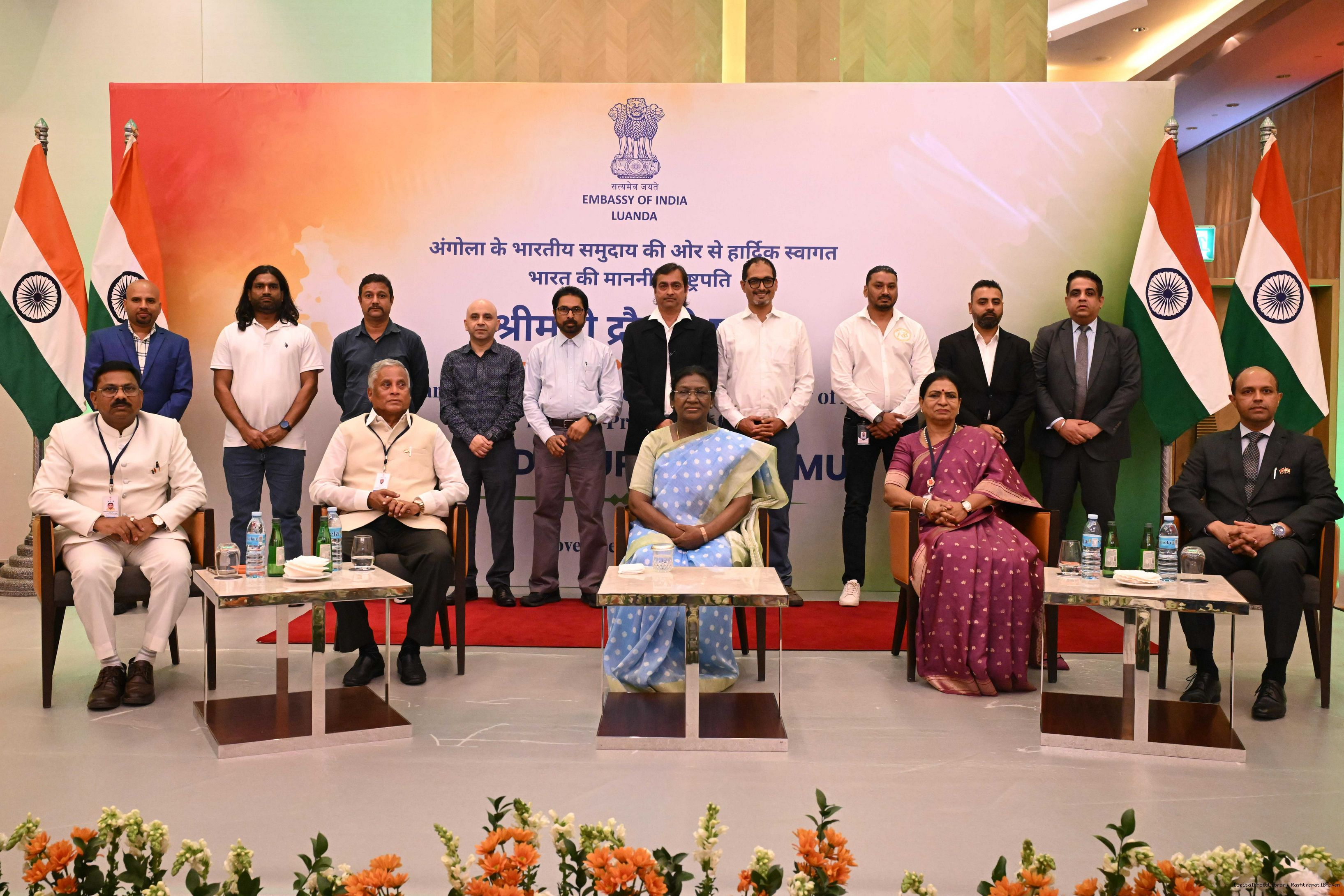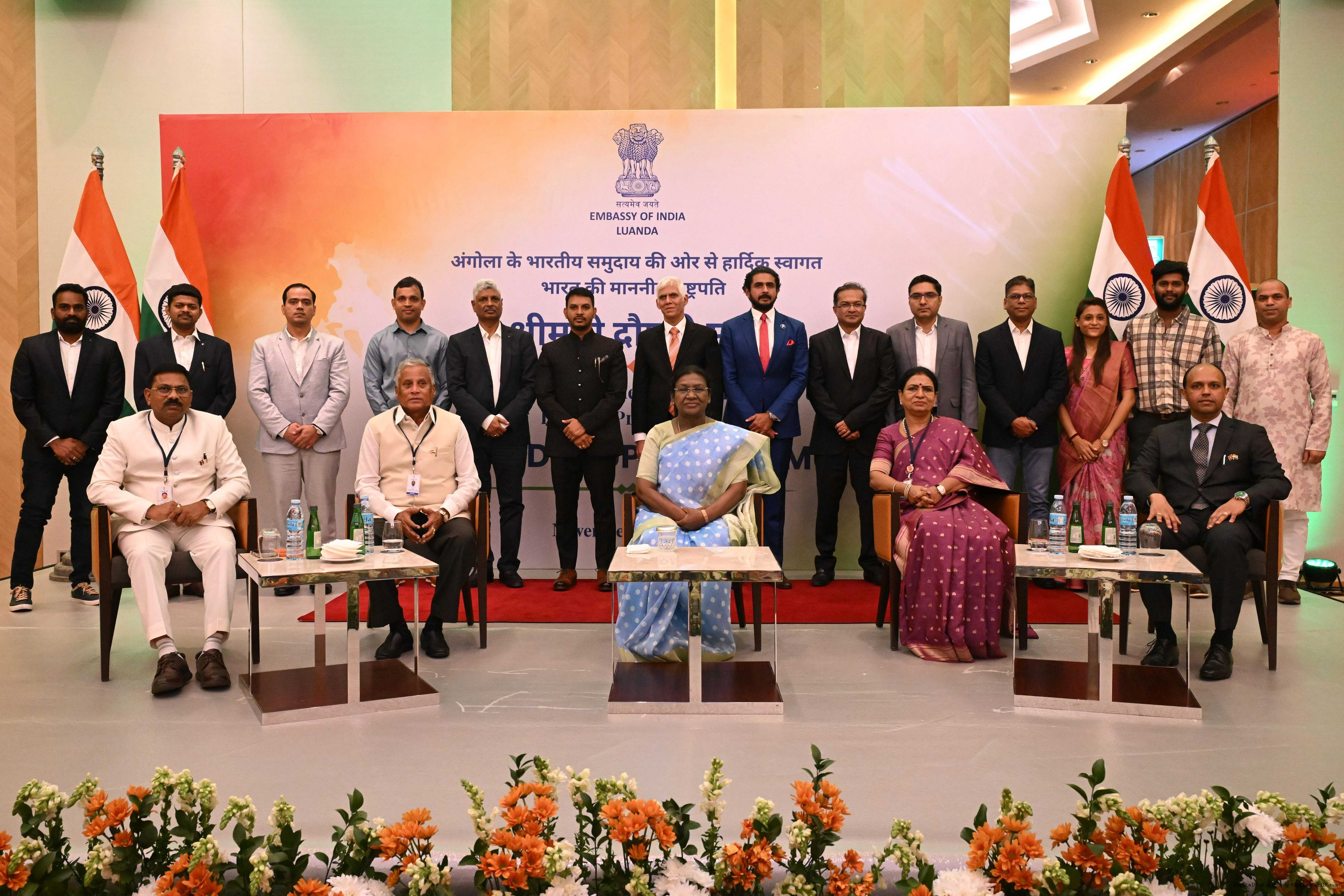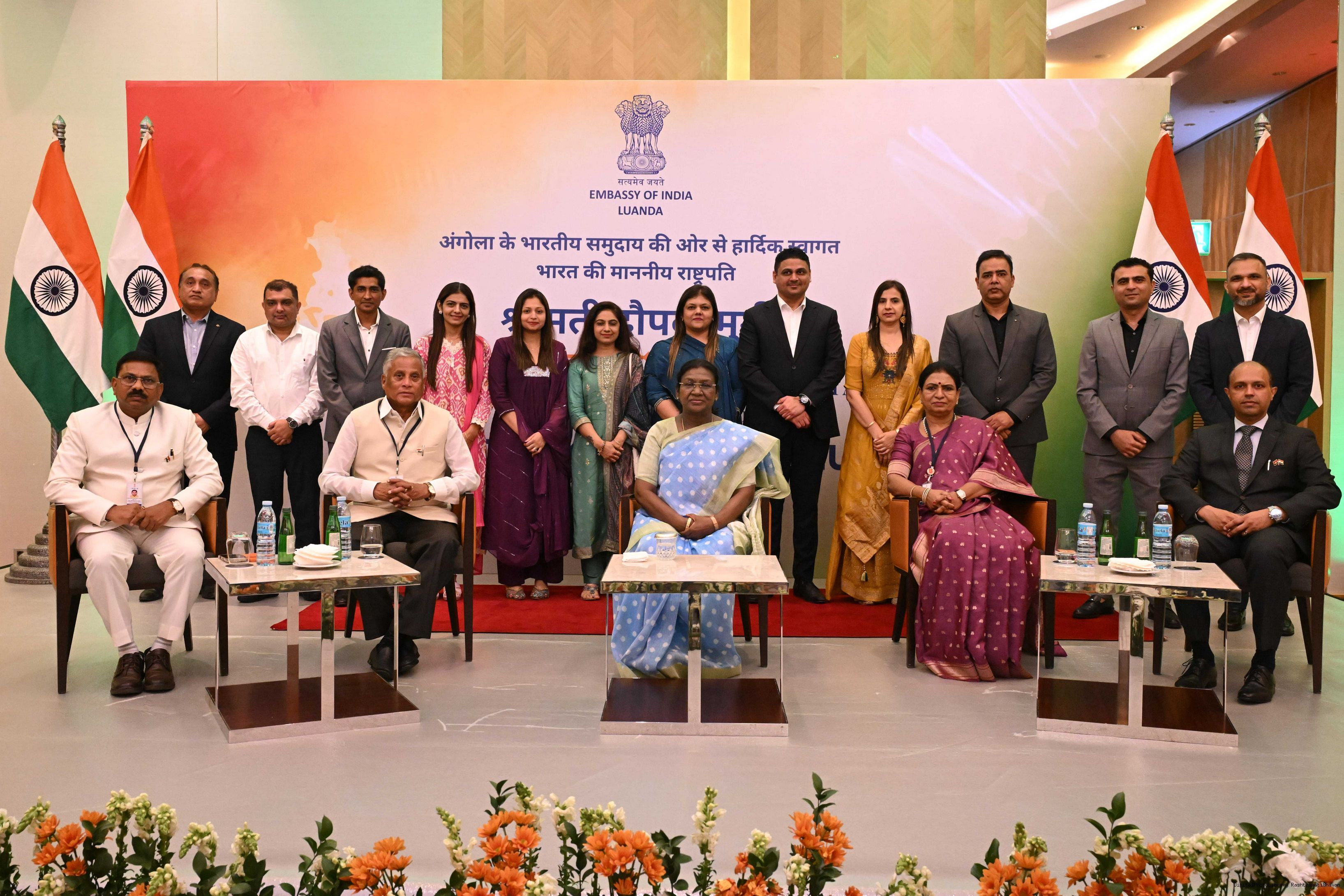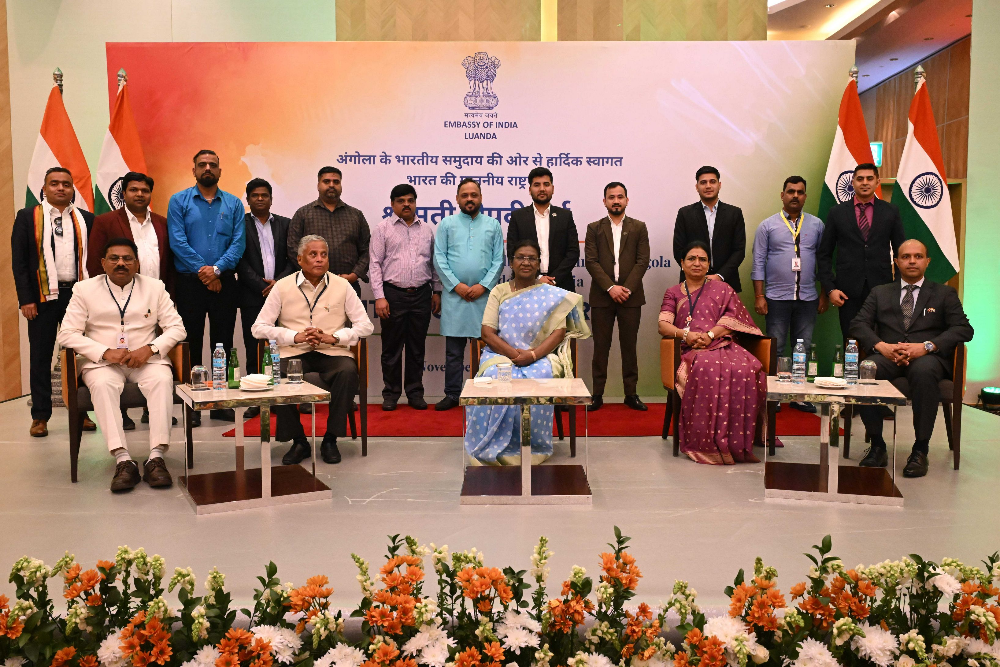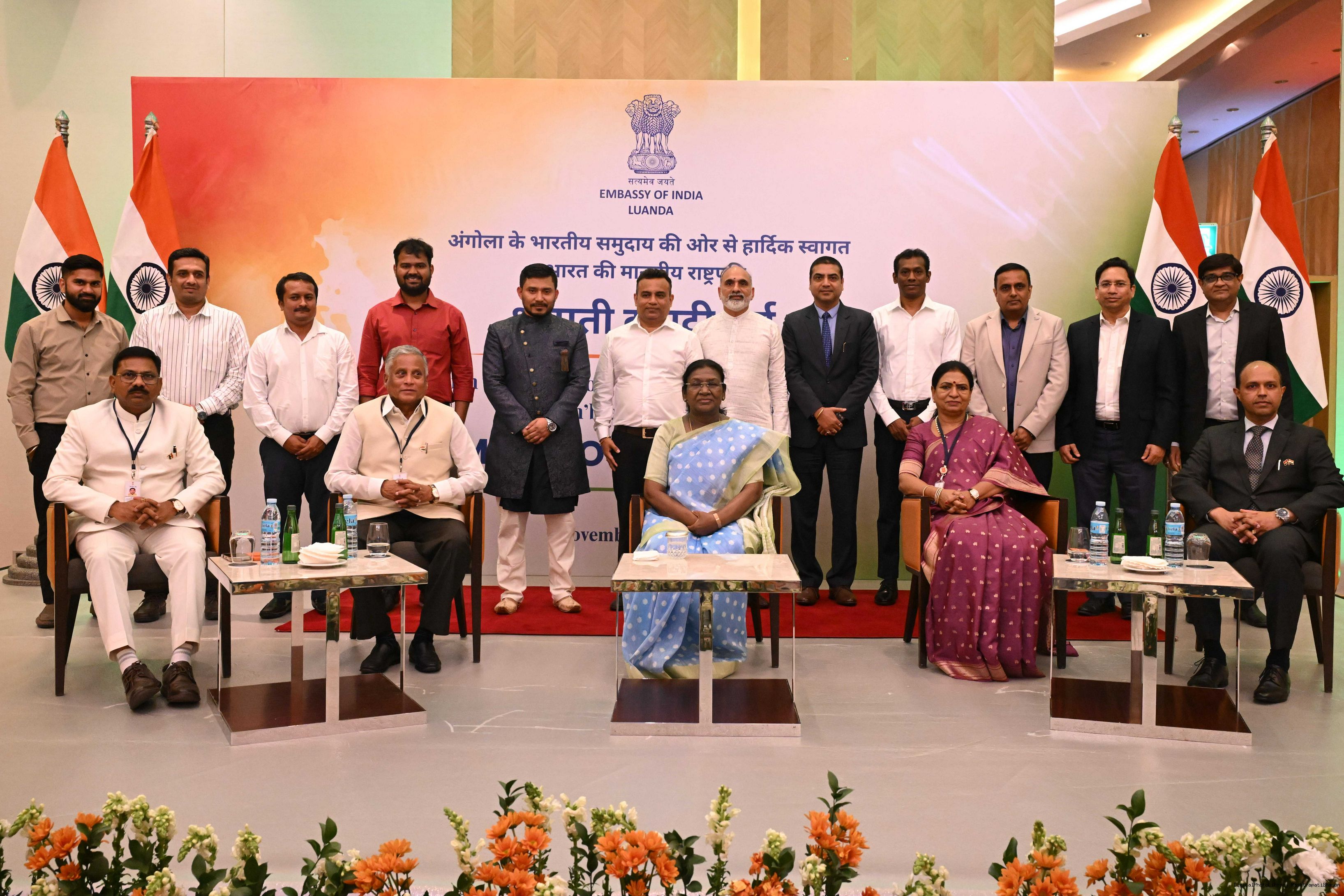 Caption: The President of India, Smt. Droupadi Murmu addressed the members of the Indian Community at a Reception hosted by the Ambassador of India to Angola at Luanda on November 10, 2025.