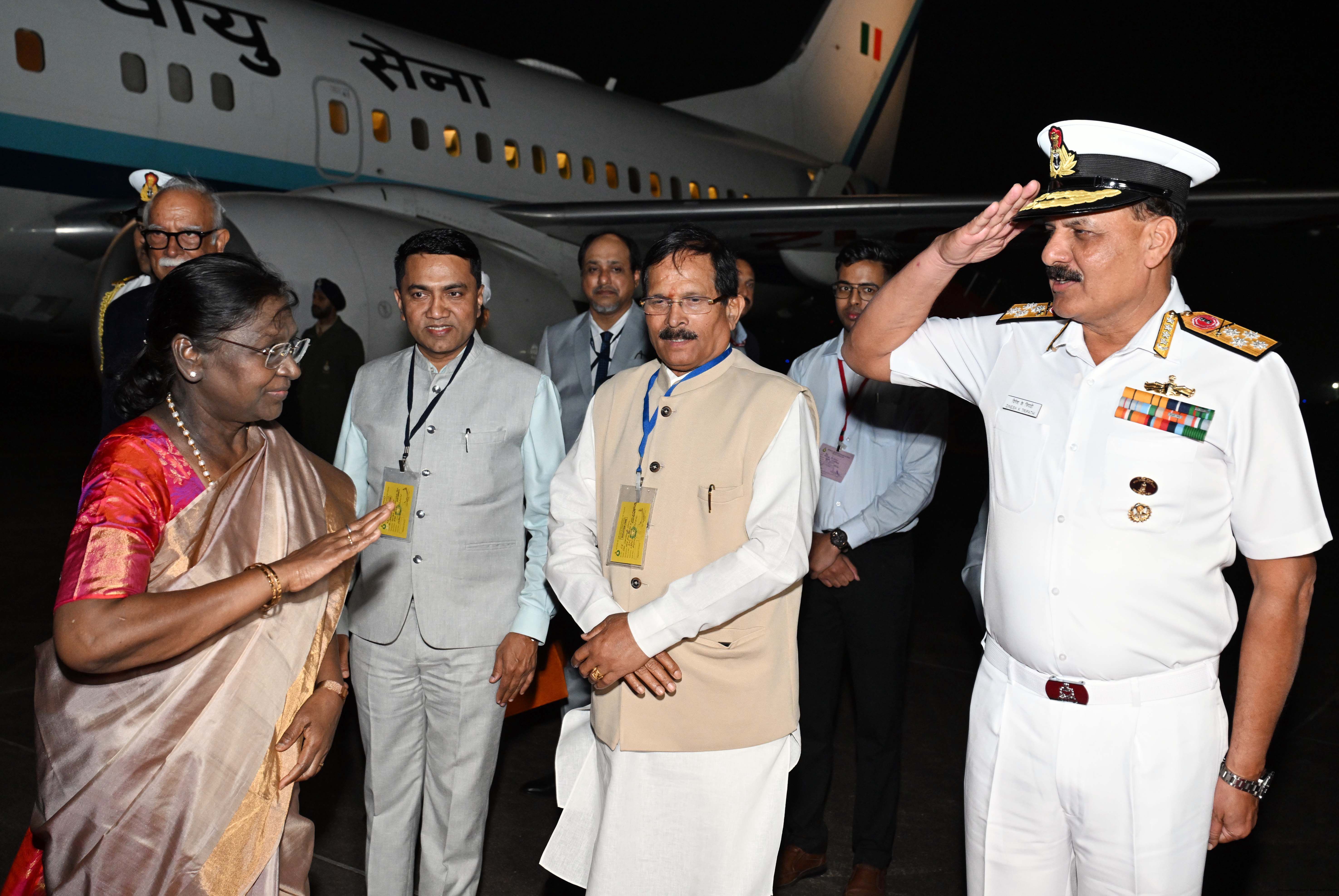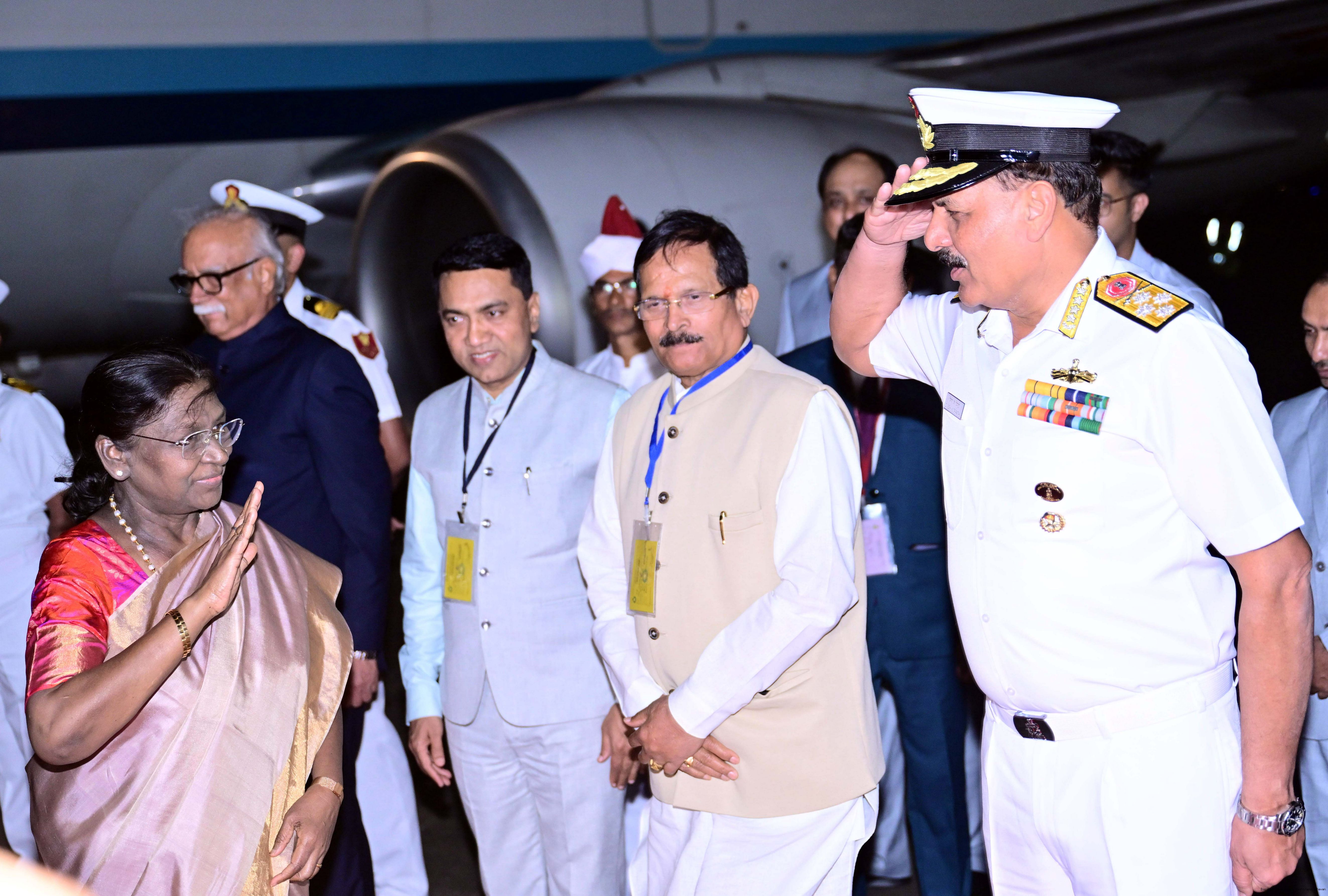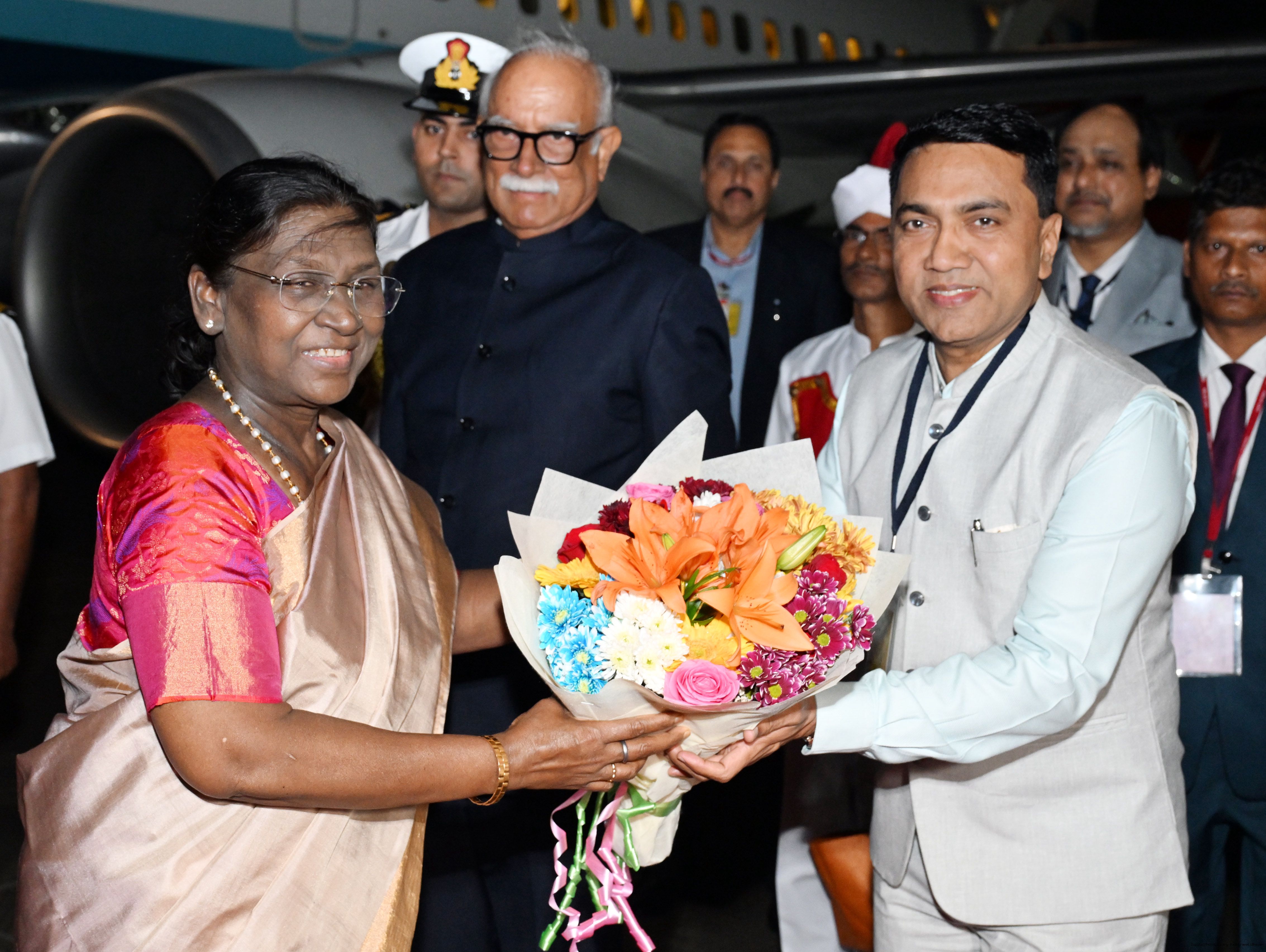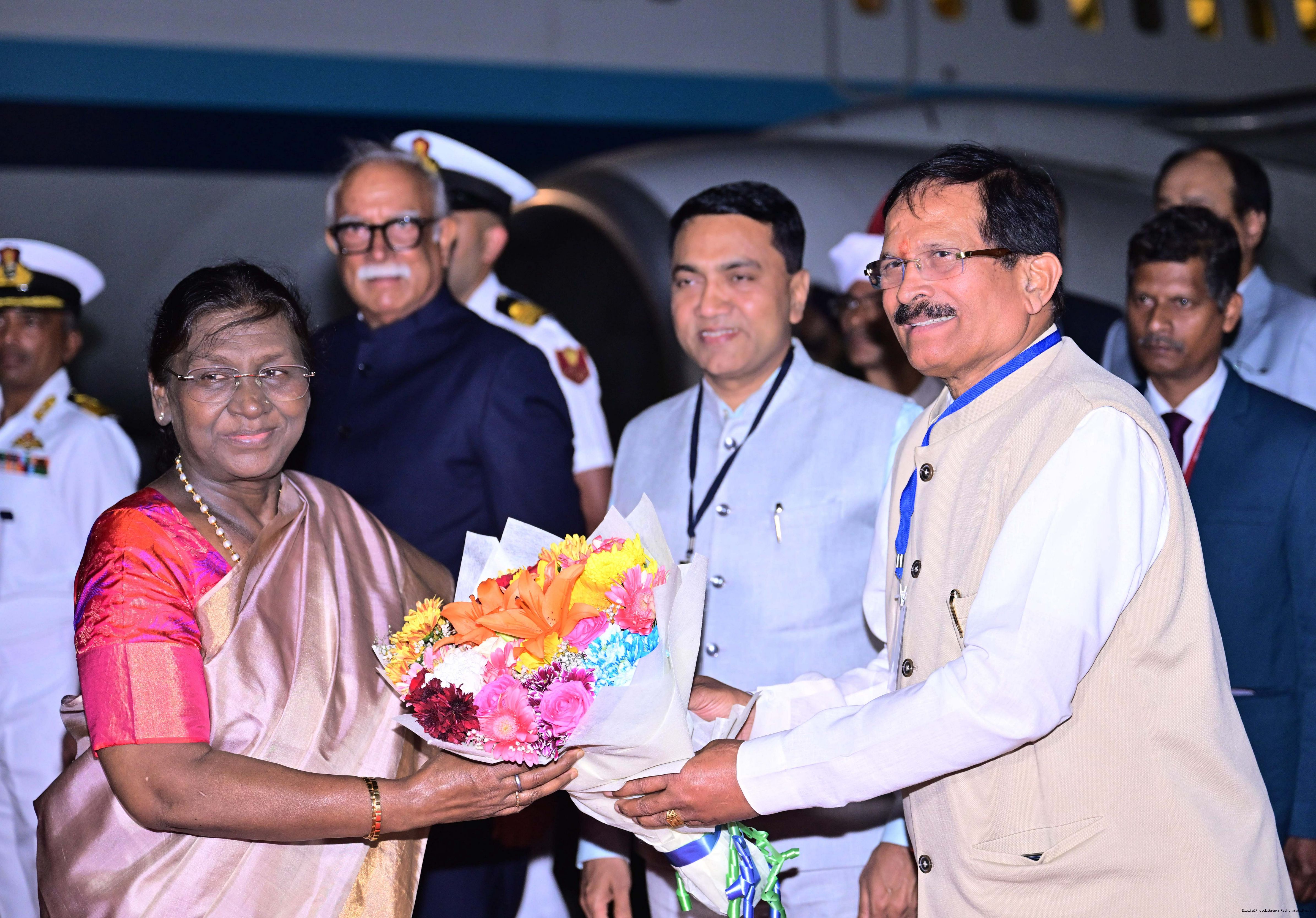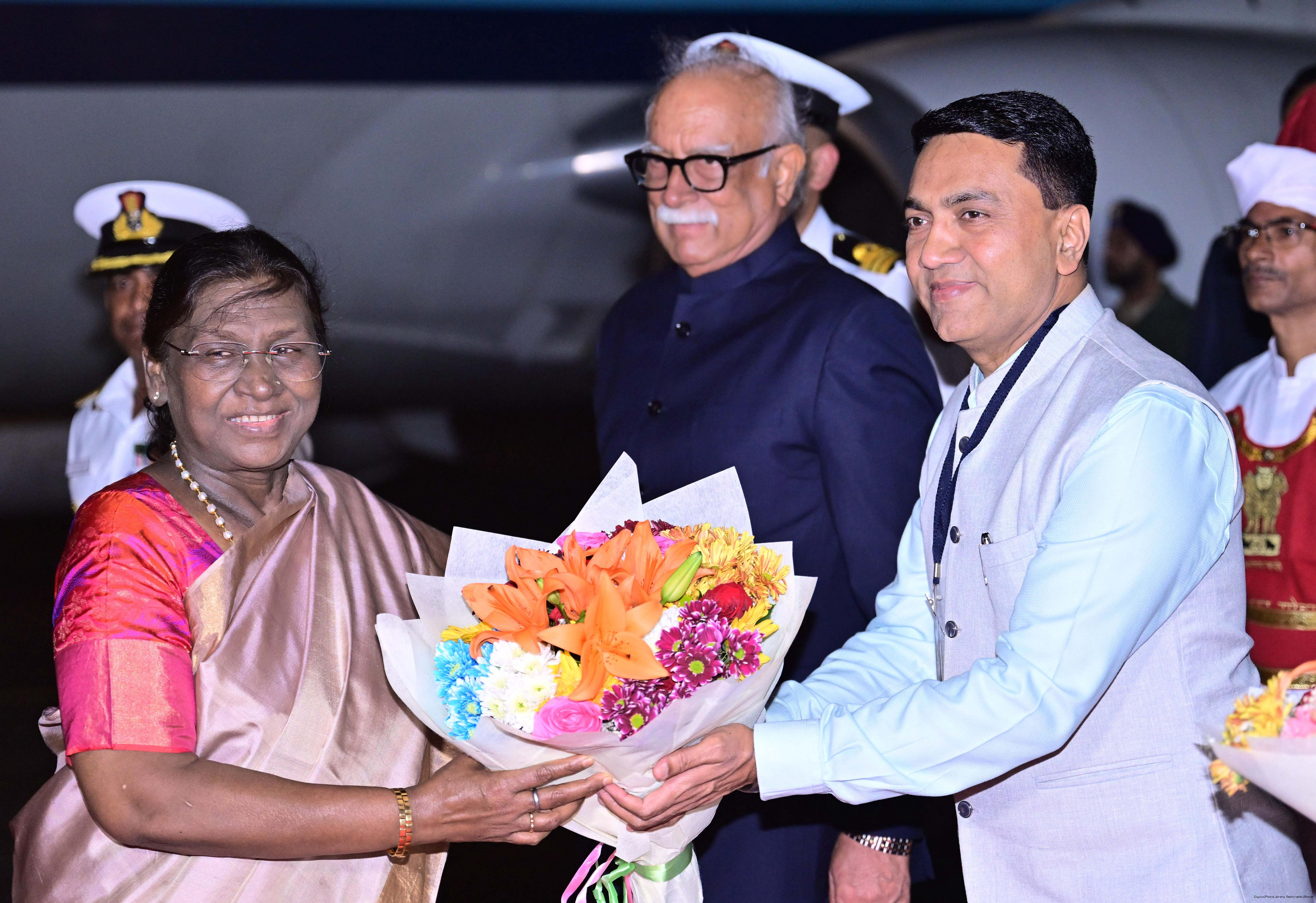 | Caption: | The Governor of Goa, Shri Pusapati Ashok Gajapathi Raju, Chief Minister Dr. Pramod Sawant, Union Minister of State for Power and New and Renewable Energy Shri Shripad Yesso Naik and Chief of the Naval Staff Admiral Dinesh K. Tripathi received the President of India, Smt. Droupadi Murmu on her arrival at Dabolim airport, Goa on December 27, 2025. |